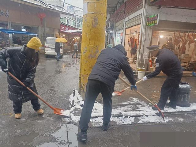 雪景美,坚守的身影更美。为保障群众安全出行,各派出所民辅警纷纷走上街头,手持铁锹,铲除路面积雪,清理道路障碍。“各位市民,路面湿滑,请小心慢行!”铲雪间隙,遇到行动不便的老人,民警快步上前搀扶;碰到推车难行的摊贩,民警主动搭把手助力。凛冽的寒风中,守护持续加温。