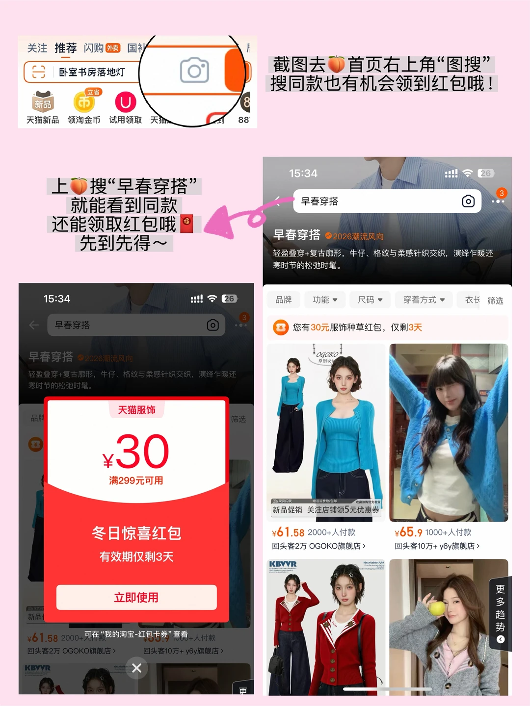或者截图去🍑首页右上角“图搜”,搜同款也有机会领到红包!