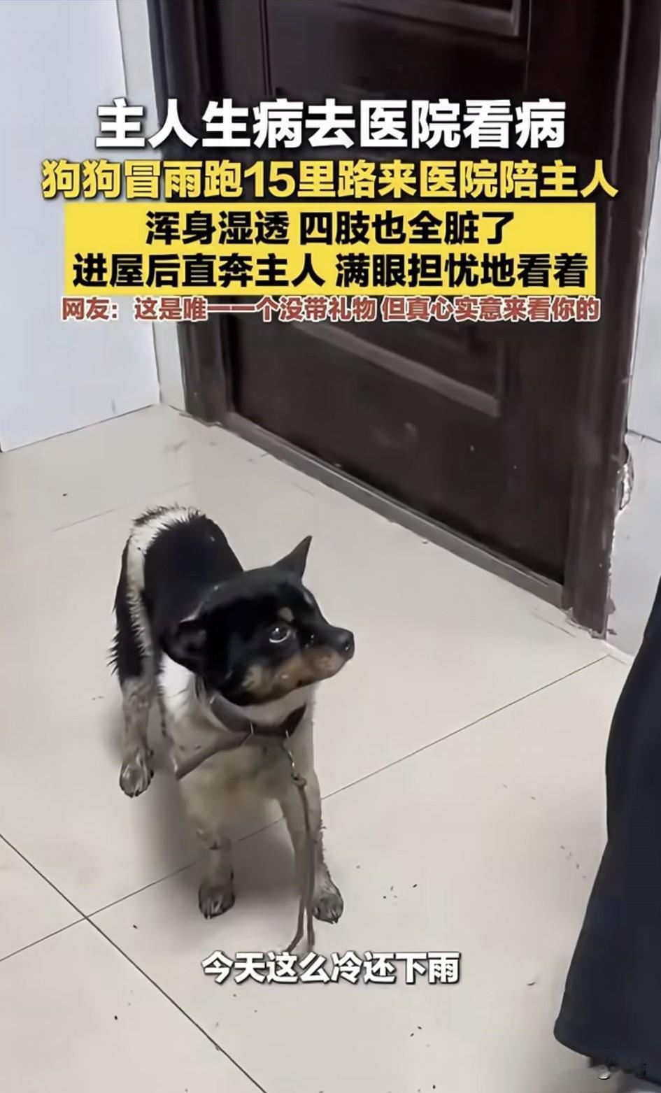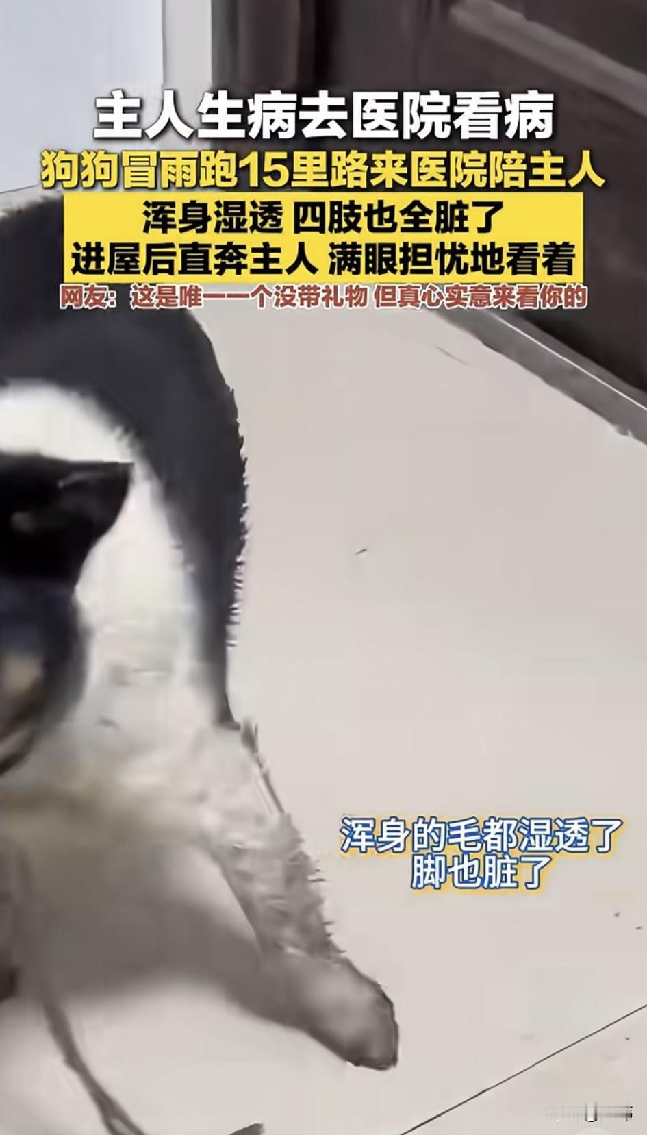 泪目了!一位大哥养了一只狗狗,平时就非常疼爱它,它也非常依赖大哥,最近大哥由于感冒发烧去医院看病,然后就在医院挂点滴了。 这下狗狗可着急了,久久不见大哥的它,居然咬断绳子冒着大雨跑了15公里来医院陪大哥,它的浑身全部湿透,四肢也全脏了,进屋后直奔大哥面前,满眼担忧地看着他。大哥顿时非常感动,也很心疼狗狗,赶紧用毛巾把它擦干,狗狗则趴在大哥身边静静地陪它挂水。 这是唯一一个没带礼物,但真心实意来看望大哥的。