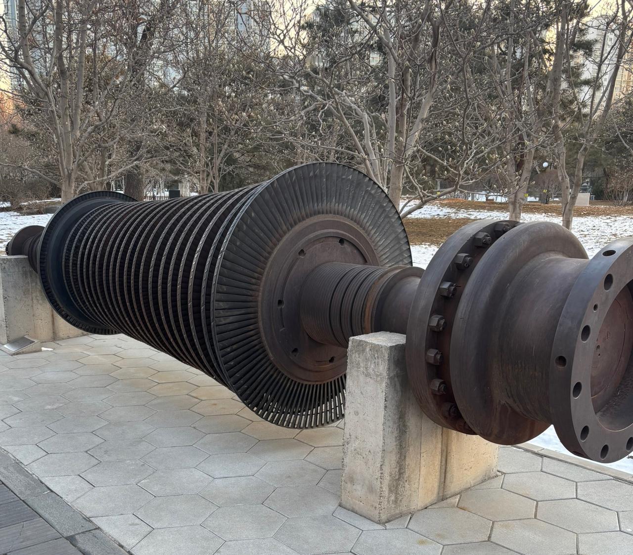 火力发电厂汽轮机高压转子 这是建国初期国家大型建设项目之一的大唐国际发电股份有限公司北京高井热电厂的1号机组汽轮机高压转子。机组由原苏联援华,1961年4月建成投运,是国内第一台高温高压100MW发电机组。其转子材质 30CrMoV,长度5.973米,重量13.67吨,代表了当时先进的重工业制造水平,是火力发电厂的核心设备之一。2005年8月机组由纯凝汽式改造为供热发电机组,转子光荣退役并赠送。目前它静静地躺在北京雕塑公园内供游人参观。 该机组在役44年累计发电309.8亿度,安全稳定运行351130小时,曾被授予“国内一流火力发电机组”称号,两次荣获全国同类型机组竞赛三等奖。她历经了首都乃至全国电力事业发展壮大的光辉历程,为北京市国民经济发展和人民生活水平的提高做出了卓越贡献。 相关火电知识链接:火力发电是通过煤在锅炉中燃烧将水加热成高温高压的蒸汽,经膨胀做功将热能转换为动能,推动汽轮机高压转子高速转动,带动发电机转子切割磁力线产生电能,输送到千家万户。