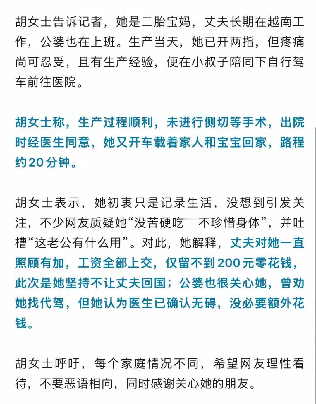 没苦硬吃?二胎宝妈已开两指忍痛自驾前往医院:丈夫在国外,对我很好,出院时也是自己开车。 其实人是最能适应环境的,有人依靠时,就会变弱,什么都不行。当没有人可以依靠时,就会变强,什么都行。 我觉得这位女士非常能干,坚强,值得敬佩称赞,不该被人指责! 她完全是一心一意为家人着想!当然我也希望她能够爱自己一点,对自己更好一点,别什么事都自己扛。 生孩子是大事,叫个代驾也花不了多少钱,没必要在这上面节省。疼痛难忍时,万一发生交通事故,那就是人间悲剧了!
