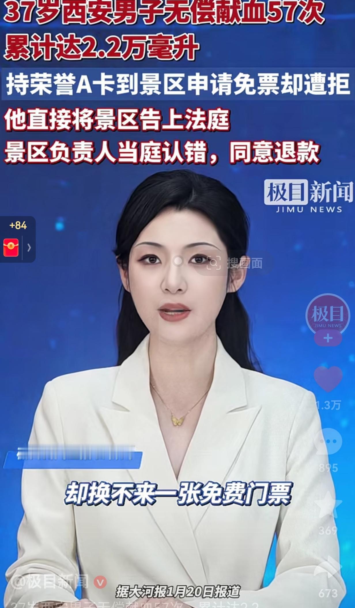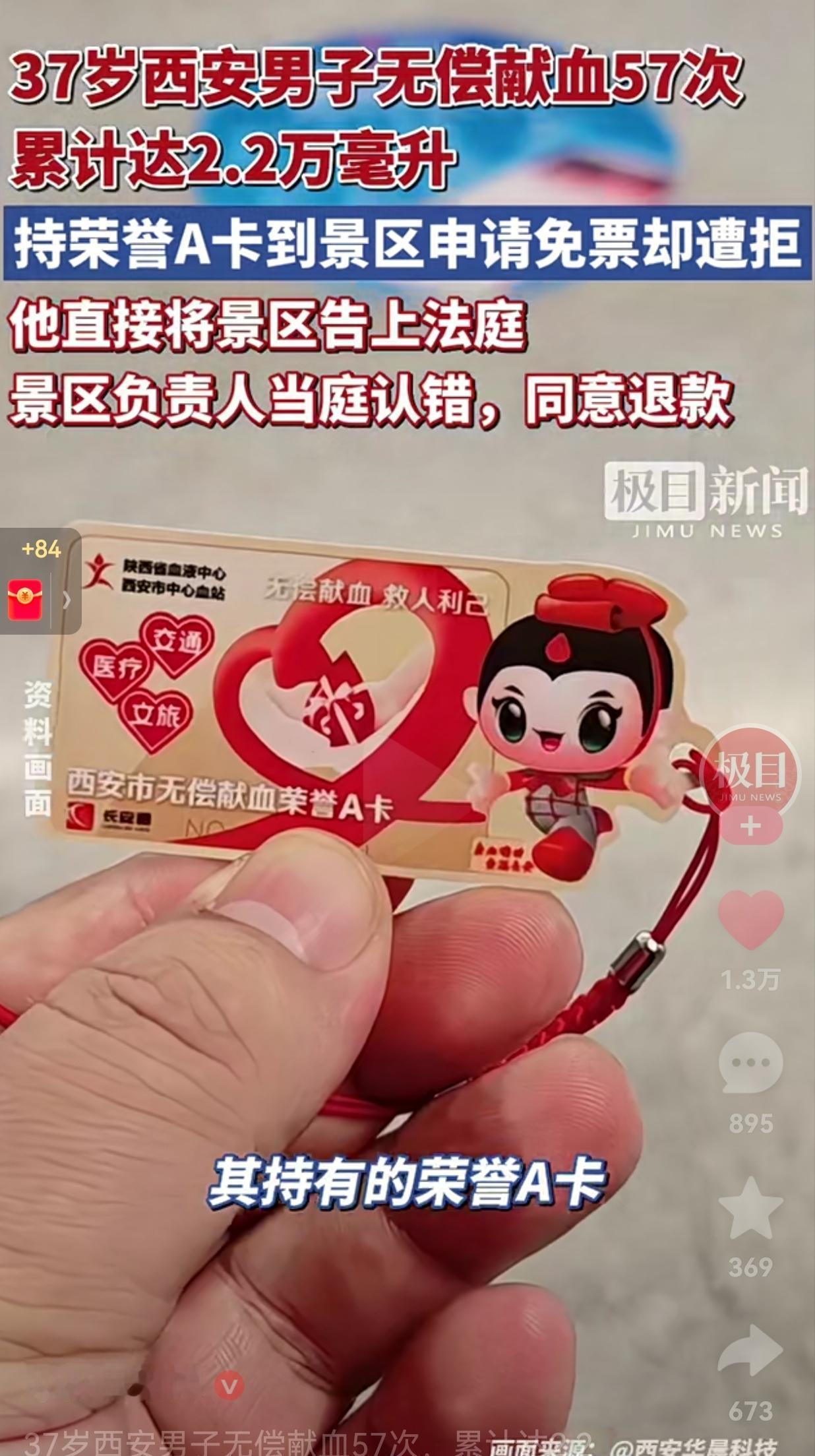 别让做好事的人寒了心!37岁的西安市民吕先生,坚持无偿献血57次,累计献血量高达2.2万毫升,这是什么概念呢?这相当于5个成年人的全身血量。 他凭着这份无私奉献的精神,拿到了西安市无偿献血荣誉A卡,这张荣誉A卡,按照规定可以享受市属A级景区免票。 可是,去年12月的一天,在他的身上,却发生了一件令他终身难忘的事情。 那一天,他拿着这张卡去赵公明文化景区申请免票时,却被工作人员以“未接免票相关通知”为由拒绝,还要求他支付50元门票。 事后,吕先生没有忍气吞声,而是选择拿起法律武器,把景区告上了法庭。 今年1月19日,案件开庭审理,在庭审现场,景区负责人当庭承认存在工作错误,同意退还门票钱。  网友看到后评论说:“人家无偿献了这么多血,还持有免门票A卡,结果,把曾经的诺言当成空话?这景区也太让人寒心了!” 还有的网友说:“吕先生做得对!他这样做,不是为了一张免费的门票,因为,一张门票才值几个钱,他是为了争这口气,为了让好心人不被辜负!” 说实话,我特别能理解吕先生的愤怒。他献血不是为了免票,但这张荣誉卡代表的是社会对他善意的肯定。 景区拒绝免票,不只是抠门,更是在否定他多年的付出。 我们常说“好人有好报”,可现实里,很多好心人却连最基本的尊重都得不到。 吕先生的做法,不只是为了自己讨回公道,更是为了提醒所有人:善意不该被辜负,承诺不该被践踏。 最后,希望所有的人,都能善待献爱心的人,而且,能信守承诺。不要说话不算话,信口开河,伤了别人的心。 (信息来源:极目新闻)