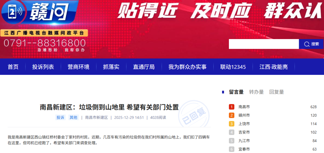 《赣问》平台转来的《南昌新建区:垃圾倒到山地里希望有关部门处置》已收悉。