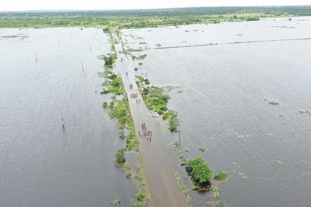 当地时间2026年1月20日,莫桑比克马普托附近,航拍视角显示居民蹚过洪水过马路。视觉中国图