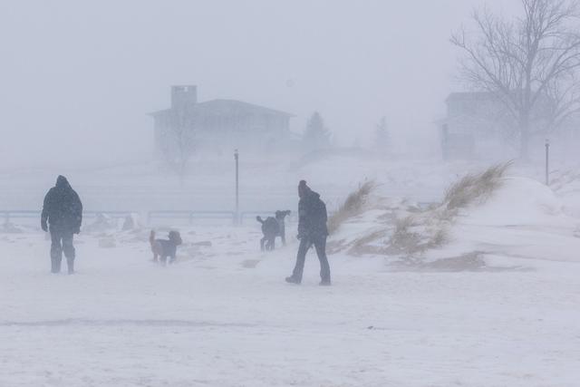 当地时间2026年1月19日,美国密歇根州遭遇暴雪天气,人们在大港州立公园遛狗。视觉中国图