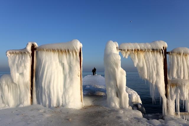 当地时间2026年1月20日,乌克兰敖德萨,寒潮来袭,海水结冰,人们站在冰冻的海滩堤岸上。视觉中国图