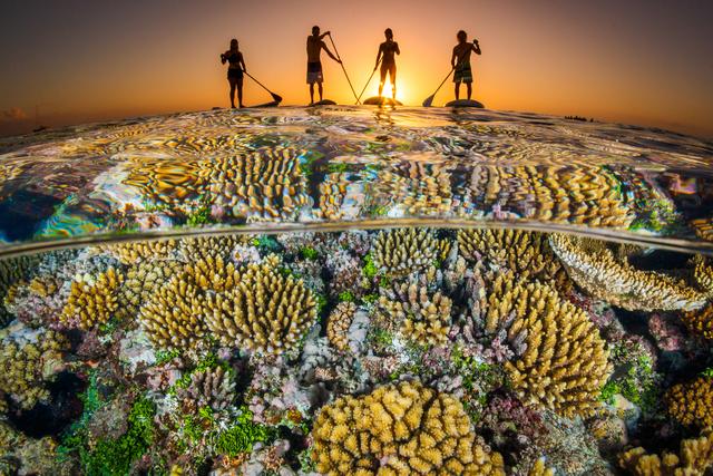 在汤加哈派,日落时分人们划船经过珊瑚礁。视觉中国图