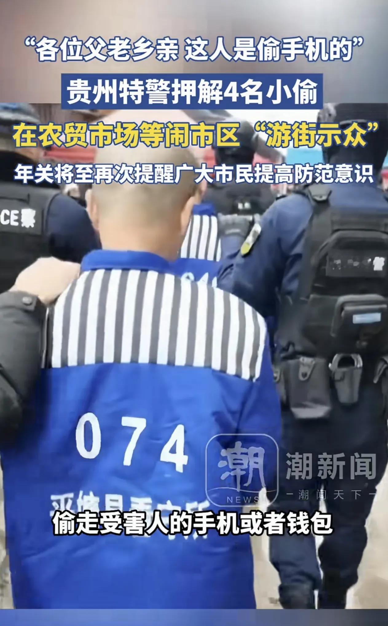 脸都不要了,还要啥“隐私”? 近日,贵州特警押着4名盗窃犯“游街示众”,这4位平时在市场上浑水摸鱼,趁机偷窃商户和顾客的财物,大家深恶痛绝。 如今,他们被押往闹市区,在犯罪现场,当众丢脸: 这个是偷手机的,这个是偷钱包的… 嫌疑犯低下了头,脸涨得红红的,完全没有了以往的嚣张气焰!围观群众则拍手叫好,直呼过瘾! 有人说,2026年了还有“游街示众”?这侵犯人的隐私了!若真要游街,应该带上头套… 要我说,对这种惯犯,谈什么“隐私”? 这些人在市场里偷偷摸摸,手机钱包都不放过,实在可恨。对这种过街老鼠,就应该人人喊打! 现在好了,当众亮相,脸也丢光了,这就叫“现世报”!这次“游街示众”,可以说是一次“普法”行动,也是对罪犯的一次有力震慑! 有人扯什么隐私,可脸都不要了,隐私还重要吗?要我说,这就是自作自受,活该! 正如现场的特警所说:当众指认现场,是固定证据、还原现场的必要环节! 被偷过多次的我,真该为此点个大大的赞!解气!