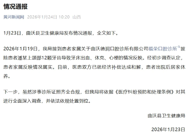 2026年1月19日,我局接到患者家属关于曲沃德润口腔诊所有限公司福荣口腔诊所拔除患者潘某上颌部12颗牙齿导致牙床出血、休克、心梗的情况反映。经初步调查认定,患者家属反映情况属实。目前,医患双方已就经济补偿达成和解,患者出院后居家休养。