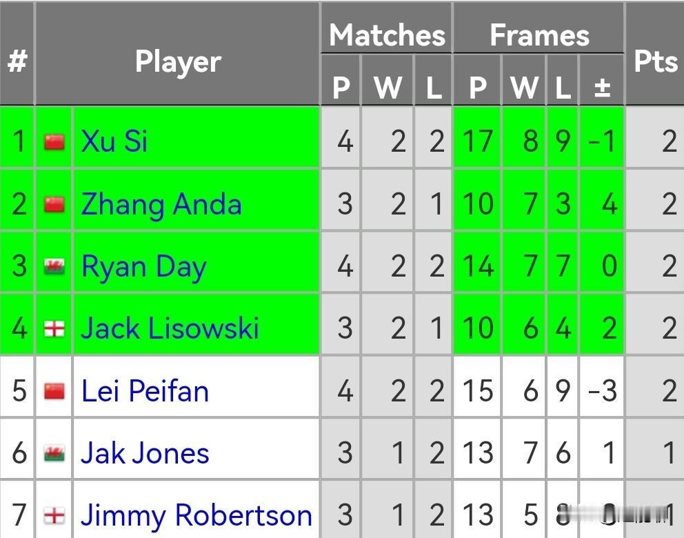 冠军联赛第7组,目前徐思暂时以2胜2负排名第一,张安达2胜1负排名第二,瑞恩戴和小司机分列3、4位。吉米罗伯逊暂时垫底。 第7组再没有出现疯狂的147井喷现象,三位中国选手也是互有胜负,莽夫的帮主小司机状态有所回暖,他将会是本组中国球员夺冠最大的竞争对手。