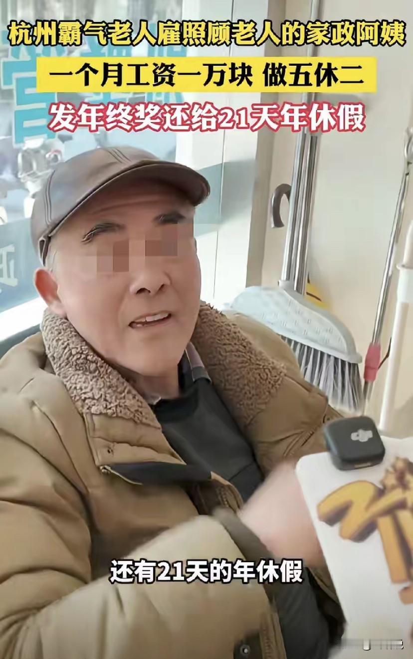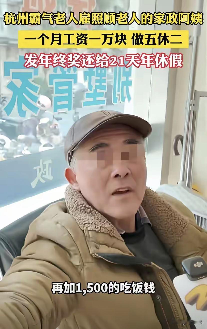 有钱任性!浙江杭州,一位大爷想找个帮忙照顾自己的家政阿姨,就来到一家家政公司,而当他提出待遇薪资后,不少人心里都惦记上了。不为别的,就因为他开的条件,确实挺打动人的 每月工资一万,每周做五休二,另外每月再贴1500元吃饭钱,这还没完,年底有年终奖,每年还给21天带薪年假。算下来,休息时间不少,收入也稳定,比不少坐办公室的年轻人待遇还好。 这事传开后,很多网友调侃说,别找阿姨了,我去行不行 虽是玩笑,却也透出大家心里的对比:一边是大学生求职不易、职场人卷得疲惫,另一边却是家政市场里出现这样一份“讲道理”的工作。它让人感觉,踏实干活、被尊重对待,这样的回报是看得见也摸得着的 有人说大爷有钱任性,我倒觉得,这更像是一种明白 年纪大了,生活上需要人搭把手,他愿意用合理的待遇,换一份稳定、用心的陪伴。这不是施舍,而是对他人劳动价值的认可 在很多家庭还在为保姆工资拉扯、为休息时间争论时,这位大爷直截了当地给出了一个“标准答案”:钱给到位,假也给够,双方都轻松