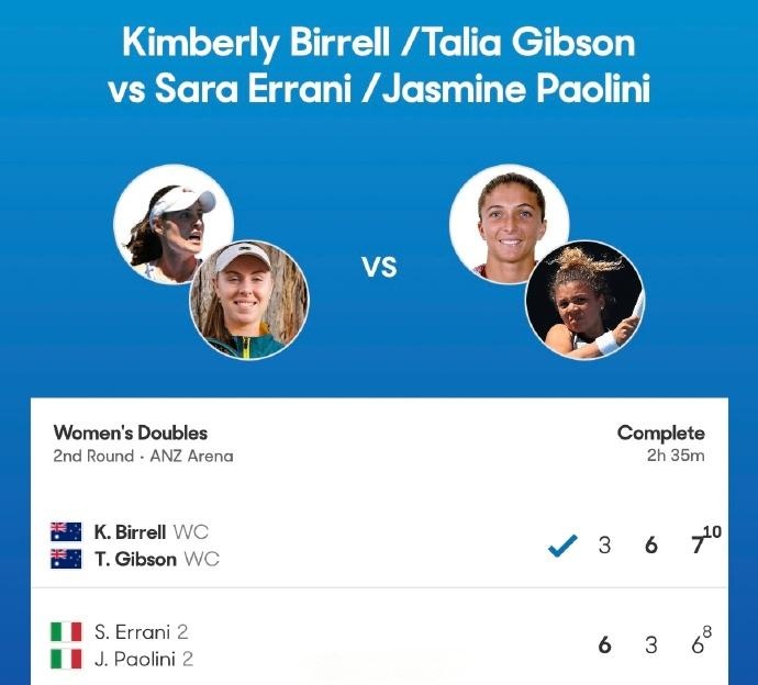 直播吧1月24日讯澳网2026女双第二轮,本土外卡组合比勒尔/吉布森以3-66-37-6(8)挑落2号种子埃拉尼/保利尼,成功晋级16强。