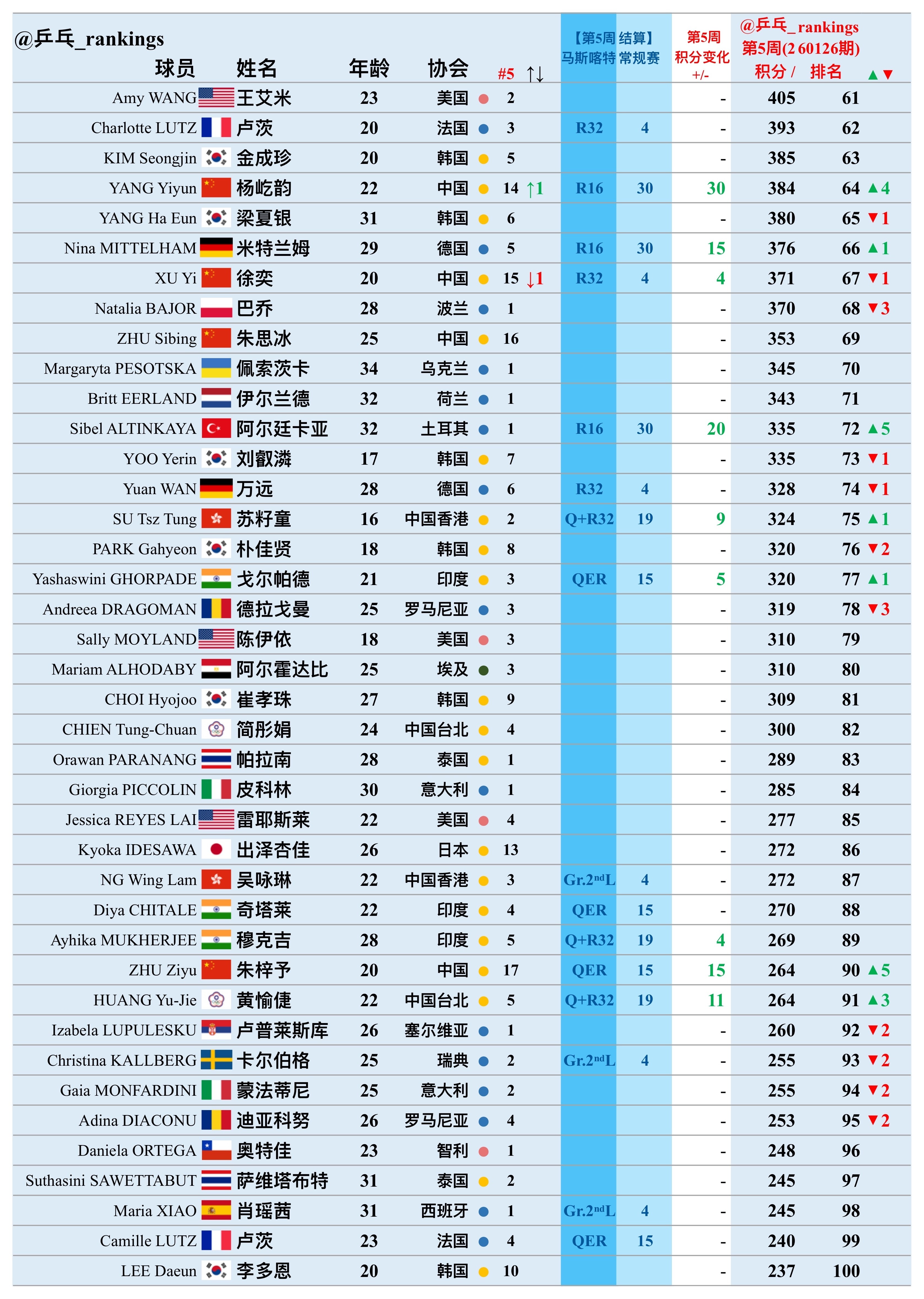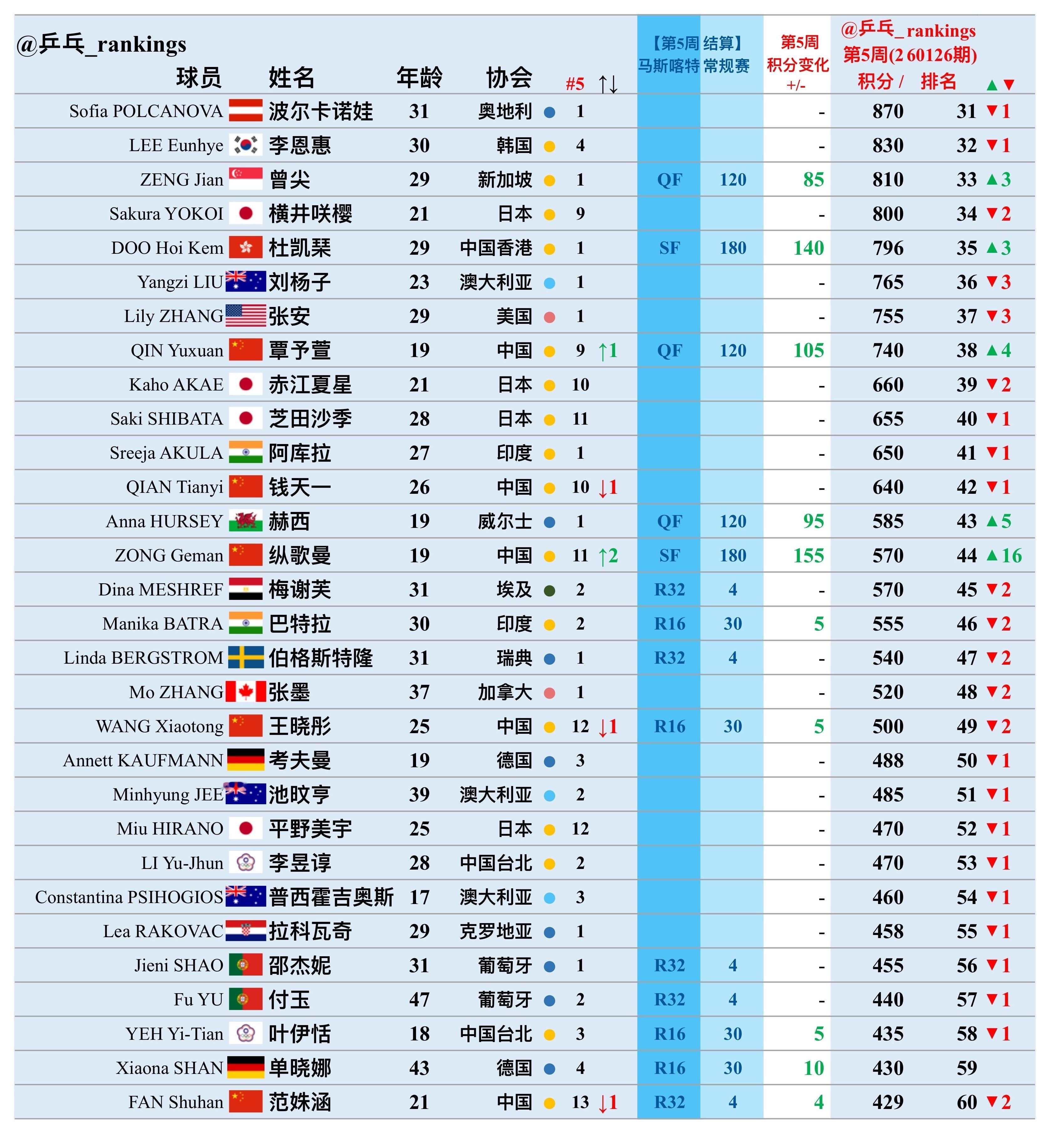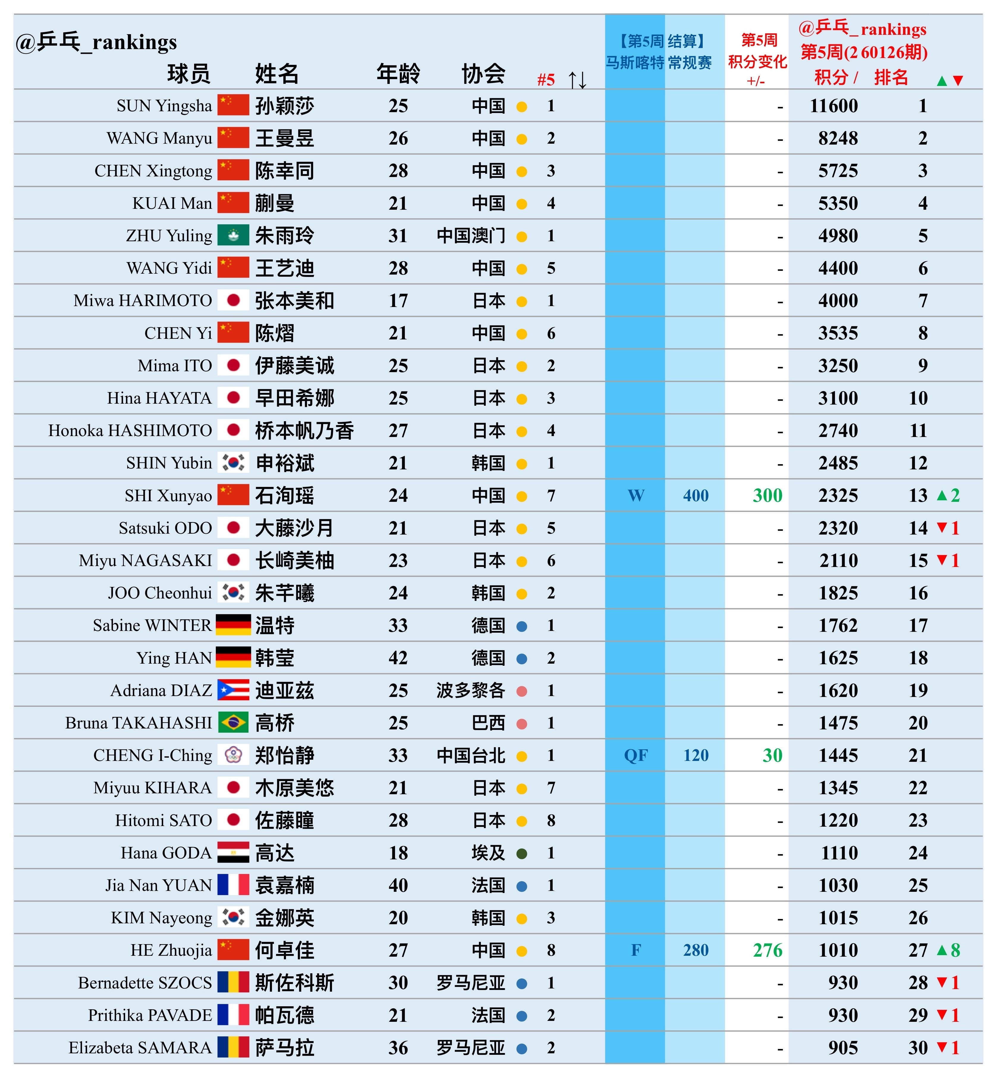 第5周世排积分变化(20260126期)【女单】🔺本周结算• WTT常规挑战赛马斯喀特站2026• WTT多哈青少常规赛、多哈青少球星赛2026【积分排名数据仅供参考,以最终实际为准】