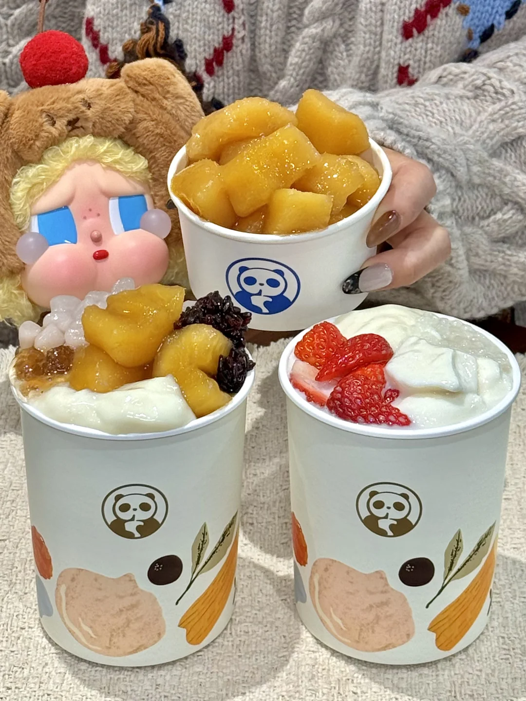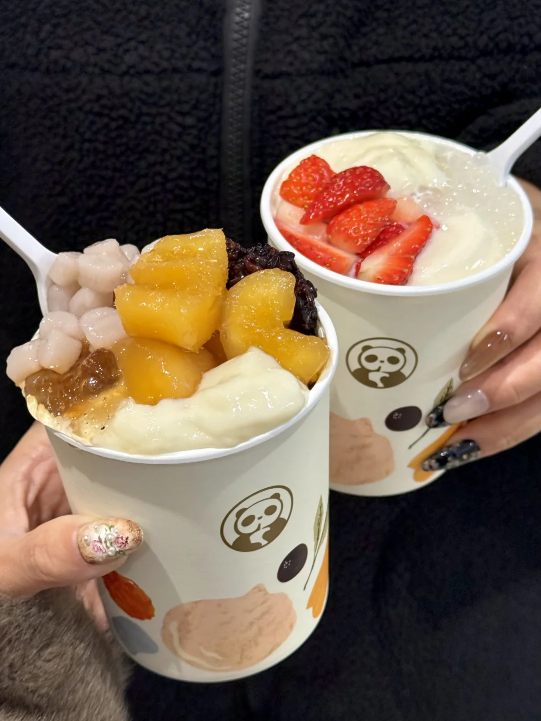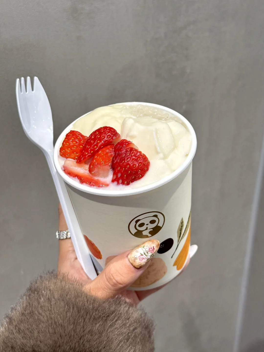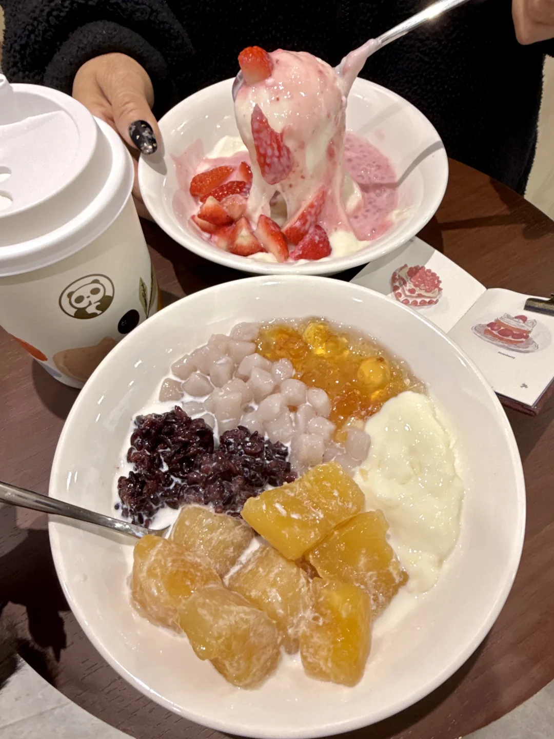 还有个粉雪草莓甜品碗🍓也很好吃,酸酸甜甜的吼清爽!!一勺下去草莓汁水先在嘴里绽开,包裹着拉丝奶麻薯、奶冻和西米,搭配芝士和酸奶的双重奶香,层次感爆炸丰富🤤