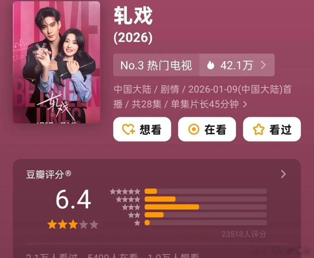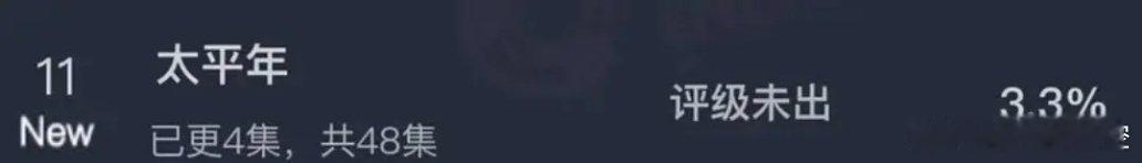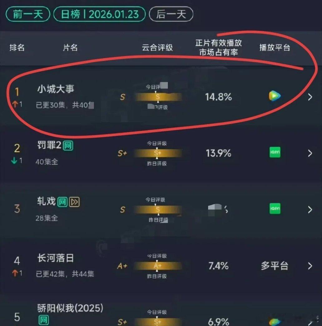 最新的云合数据出炉了,《小城大事》终于登顶。熬走了《罚罪2》和《轧戏》,在没有对手的情况下登顶,总归是有点虚的。我原以为新开播的《太平年》可能会强势一点,没想到这部剧首播云合仅为3.3%,这个市场占有率是相当糟糕的,说明很多观众并没有入场,或者说因为题材原因持观望态度。我感觉,《小城大事》市场占有率提高,很多时候是对手成全的。如果《轧戏》《罚罪2》甚至《骄阳似我》都没完结,这部剧是绝不可能登顶,恐怕进前三都困难。网传杨紫胡歌《生命树》月底要在央八开播,应该是要接档赵丽颖的《小城大事》,我就在想,如果这两部同时开播对打, 会不会更能看出谁更有水平?比较中才能看出优劣。总之,今年作为开年大戏的《小城大事》,整体是让人失望的。《轧戏》豆瓣口碑6.4分,不知道《小城大事》能不能超过这个口碑,年代剧如果口碑不过7分,基本可以判定失败了。