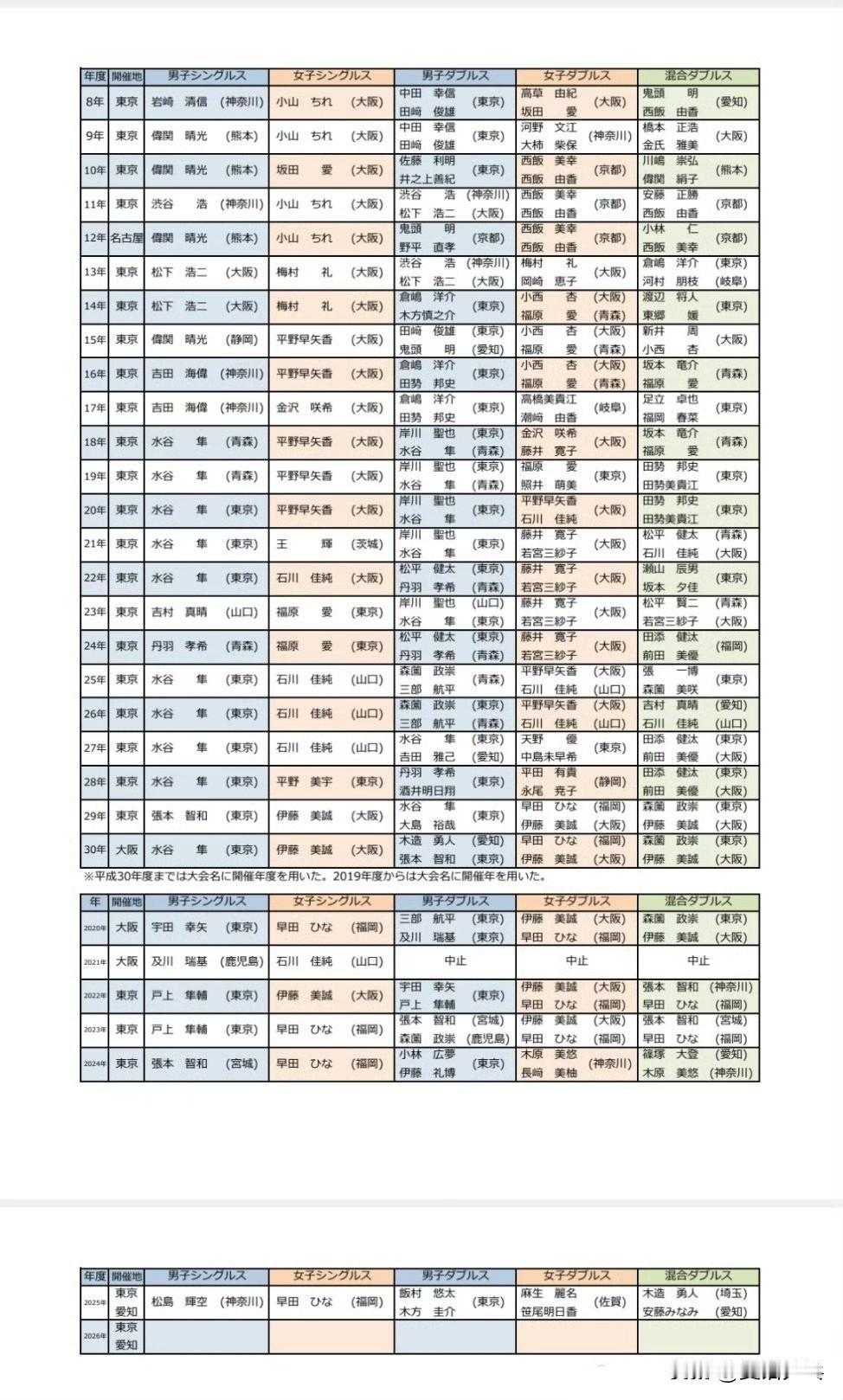 全日锦从1996-2015年的冠军汇总👀 其中水谷隼从07年-19年连续13届晋级男单决赛,共获得10座冠军。 今年的卫冕冠军分别是松岛辉空、早田希娜、饭村悠太/木方圭介、麻生丽名/笹尾明日香、木造勇人/安藤美奈美 2026.1.24