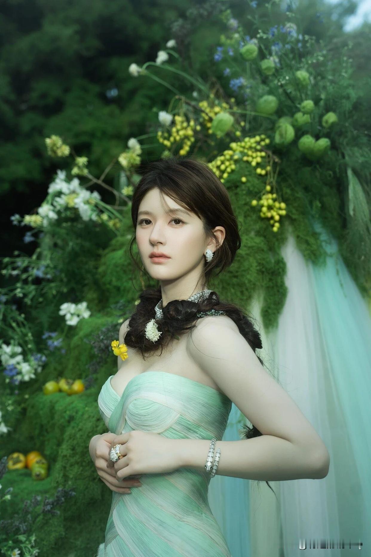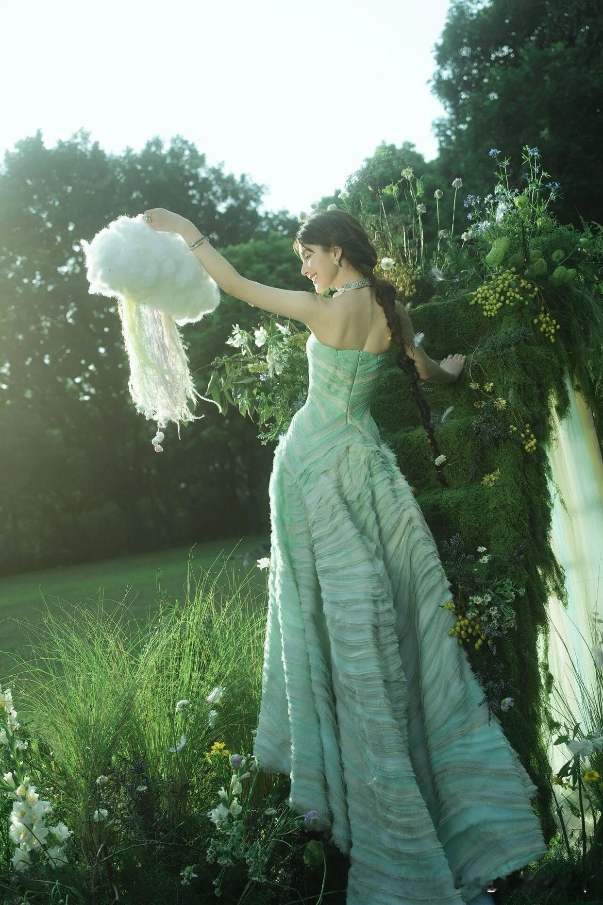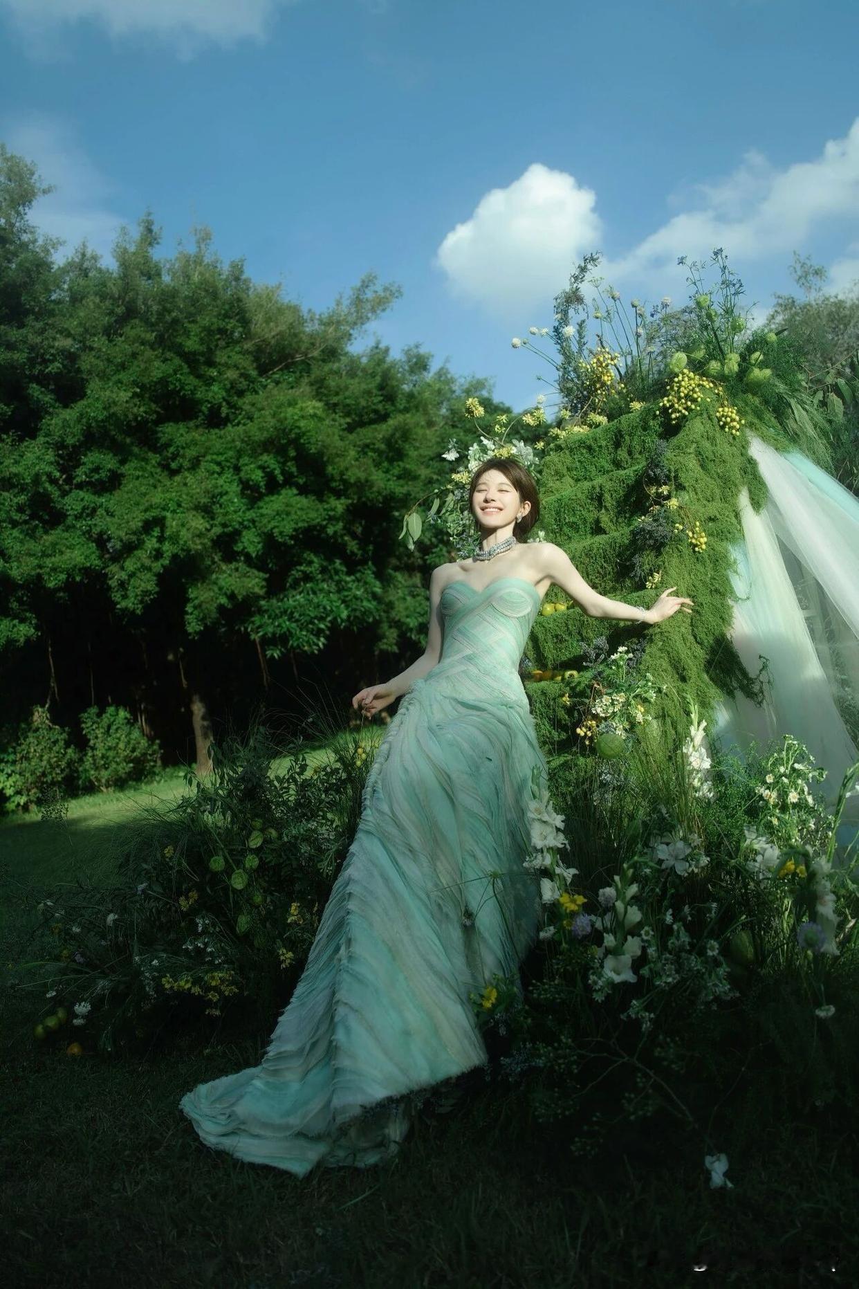 赵露思 绿光森林,甜系裹胸裙花园写真