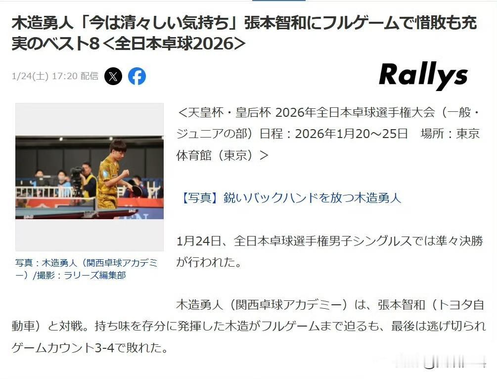 木造勇人赛后采访部分内容,提到张本的耐心和强大的心理带来了他最终的获胜。 【日媒节选】 木造:虽然没能达到原本设定的“站上领奖台”的目标,但现在能以一种比较清爽的心情结束比赛。 ——这种“清爽感”来自哪里呢? 木造:我时隔很久再次进入排名段(16强),而且也成功向之前在社会人比赛中输过的笠原先生完成了复仇。 最后一场是以‘向对手发起挑战’的立场去打的,但能打出这样一场好比赛,也让我切实感受到自己或许真的在成长。这一点让我能以清爽的心情结束本届比赛。 ——今天的打法相当果断,那么你觉得自己成长的地方体现在哪? 木造:即便是在非常艰难的局面下,也没有变得畏缩,而是能够去执行自己心里所想的战术。我觉得在精神层面上,自己确实有所成长。 ——你和张本选手已经交手很多次了,今天是以怎样的战术来应对的呢? 木造:他本来就是一名反手非常出色的选手,这一点我很清楚。所以要么去反制他的反手,要么由我这边从正手发起进攻。 赛前我也仔细看了张本选手的比赛,尤其是他和王楚钦选手的那场,对他是如何作战的,一边观察一边思考。 我觉得这些多少起到了一些效果,但最后还是对方的耐心,以及心理上的强大,在关键时刻体现了出来,最终形成了这个结果。 …… ——此前在全日本赛上也有一段时间成绩不太理想,这次能打到这种程度,应该也有不小的感受吧? 木造:说实话,以前的全日本赛留下的几乎都是遗憾。 我一直以为自己都是以不错的准备去参赛的,但可能总有某些地方欠缺。这次让我感觉到,终于有了一届‘很充实的全日本’。 希望明年也能再次迎来像今年这样充实的全日本赛,我会继续努力。 ——这次应该也让球迷看到了‘木造勇人在这里’的存在感,最后能谈谈今后的决心吗? 木造:老实说,我也想多参加国际比赛、提升世界排名,但在费用方面存在现实问题,没法参加太多。 目前还是以国内赛事为主,但我的目标是,先把世界排名提升到两位数,争取成为世锦赛的日本代表。为此,我会全力以赴去努力。(机翻) Cr: Rallys 2026.1.24