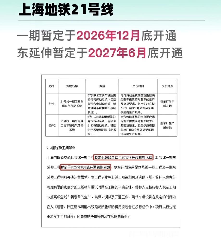 浦东人民大喜报➡️上海地铁21号线即将开启 浦东的小伙伴们注意啦!期待已久的地铁21号线终于传来了确切消息! 这条贯穿浦东核心区的黄金线路,一期工程确定在2026年12月底通车,东延伸段也将在2027年6月底跟上。 整条线总长约42公里,分成两段: 一期工程:从东靖路站到六陈路站,全长约28公里,一共设18个站。 一期东延伸:从浦东机场T3航站楼站到六陈路站,全长约14公里,设5个站。 它把金桥、张江、迪士尼、上海东站和浦东机场T3航站楼都串起来了,以后通勤、逛乐园、赶火车飞机都方便太多了! 对住在沿线、在张江或金桥上班的朋友来说,这绝对是天大的好消息: 1、上班通勤时间能大幅缩短 2、周末去迪士尼玩不用再转好几趟车 3、去上海东站和浦东机场也更快捷 这条线路开通后,不仅能缓解浦东东部的交通压力,还能让金桥、张江这些核心区域的人才流动更顺畅,带动整个浦东东部一起发展。 沿线的居民出行选择会更丰富,生活也会更便利,周边的区域价值也肯定会跟着水涨船高。