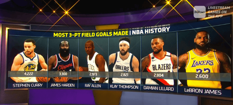 詹姆斯在上一场对阵快船的比赛中投中了个人生涯第2600记三分,历史唯一达成此数据的前锋。