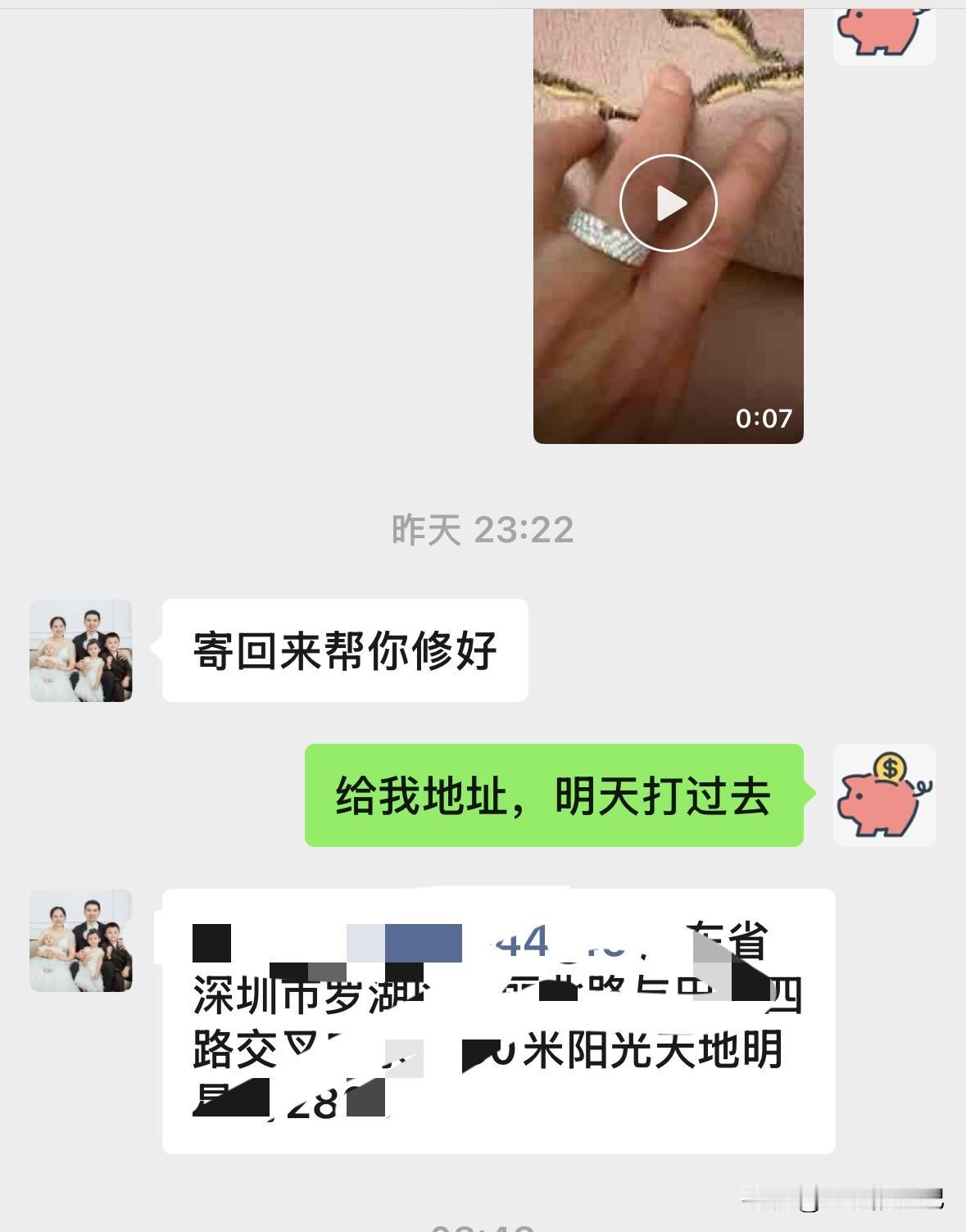 戒指上的钻石不知道什么时候丢了一颗,, 买首饰,尽量别买这种带钻的,我这个当初拿到手就怕钻掉,昨天果然就发现掉了一颗。 昨天发现钻石掉了以后,联系了卖家,今天邮回去,她们负责修理。 这样的事情在镶嵌的鞋子上也发生了,我两万多的鞋子,水钻掉了,但是没有办法修理。 我买的发卡4000多块钱的,也是上面的钻掉了,也拿回专卖店去进行了修理。 所以,我拿到手,就有这样的担心,所以才会及时发现这个问题。 现在的售后保障还是很好的,也让我们在选择喜欢的款式时,少了很多后顾之忧,但是,我也建议大家尽可能不买这样镶嵌的首饰,毕竟多了一些没必要的麻烦,来回邮寄,还要承担一些风险。