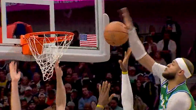 第四节比赛中,加福德身后补防排球大帽詹姆斯,湖人末节4中0还未得分。