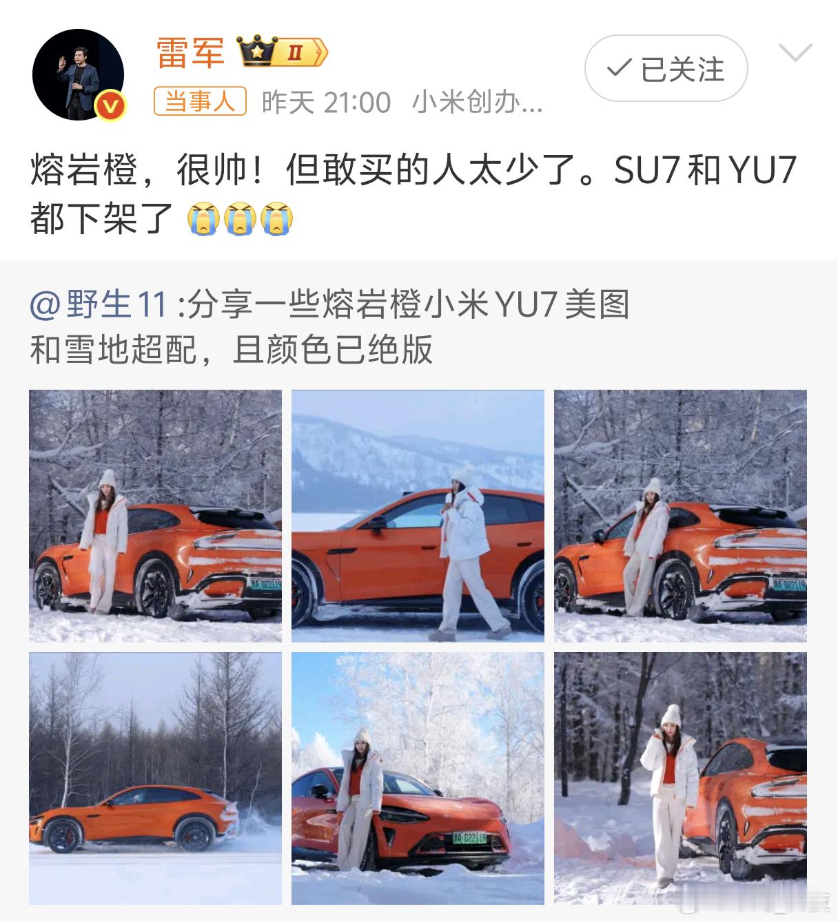 雷军称小米汽车熔岩橙配色敢买的人太少 个人觉得熔岩橙配色就是因为太酷了,一般人驾驭不了这款颜色。大家觉得呢?