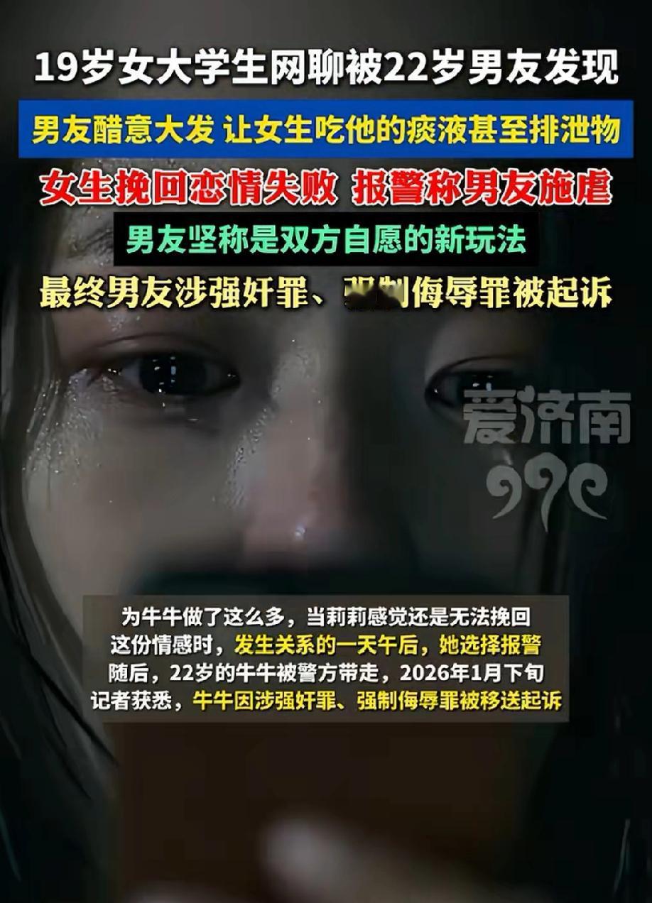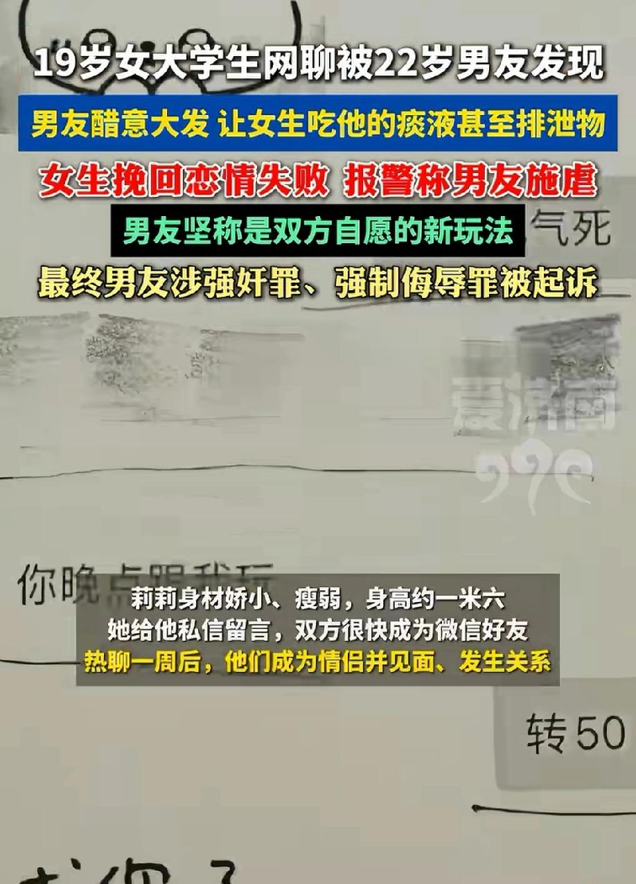 “玩的太花了!”广西南宁,大三男生在网络平台晒出自己高大帅气的照片,吸引了19岁女大学的注意,两人很快发展为情侣关系。恋爱7个月,男生发现女友和别的男生网聊,他醋意大发,逼着女生吃他的痰液和排泄物,还用烟头烫女友。女友挽回恋情失败,在一次发生关系后,报警声称遭到男友强奸。尽管男友辩解他们这是自愿的新玩法,检察机关还是以强奸罪、强制侮辱罪对其提起公诉。 2024年8月中旬,19岁的女大学生莉莉刷短视频时,无意间刷到了大三男生小牛的账号。 视频里的小牛一米八五的身高,身材健硕,长相帅气,莉莉一下子就被吸引了,主动发私信留了言,没多久两人就加上了微信。 微信里聊了一周,两人感觉挺合得来,就在8月25日确定了恋爱关系,当天就见了面,还越过了道德的鸿沟。 恋爱后的七个月里,他们相处得挺融洽,一起逛街、吃饭,有什么事都能好好沟通,莉莉觉得小牛也挺照顾她,她对小牛有了很深的情感依赖。 可这一切在2025年3月16日这天变了样。 那天晚上,小牛在自己校外租住的出租屋里,发现莉莉在跟别的男生网聊。 其实莉莉就是和一起打游戏的网友随便聊了聊,没什么出格的事,但小牛醋意大发,当场就生了气。 莉莉不想因为这点事分手,心里觉得有点愧对小牛,想着能挽回这段感情,就一直顺着小牛。 可让莉莉没想到的是,小牛竟然逼着莉莉吃他的痰液,甚至排泄物,还扇她耳光。 莉莉虽然心里抗拒,但为了留住恋情,还是照做了。 本以为这样能让小牛消气,可小牛的心里并没放下这件事。 几天后,莉莉再去小牛的出租屋时,小牛又用烟头烫了她的手臂和后背,莉莉心里清楚,这还是因为之前自己和别的男生聊天的事。 没过两天,莉莉又来到出租屋,小牛故技重施,不仅让她吃秽物、扇她耳光,还拿烟头烫她的手臂、后背、大腿内侧甚至胸部。 本以为自己的退让能挽回感情,不成想,小牛还告诉莉莉,他认识了新的女生,还一起逛了街,这让莉莉心里凉了半截,她意识到这段感情可能真的无法挽回。 3月25日凌晨,小牛又一次逼着莉莉吃秽物,莉莉依旧照做了。之后两人各自玩了会儿手机就上床睡了。 事后,莉莉离开了出租屋,越想越委屈,也对小牛彻底失望了,她怕小牛之后还会纠缠自己,在朋友的建议下,她报了警。 没多久,22岁的小牛就被警方带走了。 小牛被抓后,一直拒绝认罪认罚,他坚称双方是自愿的,没有威胁或强迫。 在他看来,那些让莉莉吃秽物、扇耳光、用烟头烫的行为,都是情侣间的“玩法”,是从网上学来的游戏方式,目的就是寻求性刺激。 至于烫烟头,也是“她喊停就停”,还说莉莉也扇过他耳光,不是自己单方面的惩罚。 小牛甚至觉得,莉莉报警就是“因爱生恨”,自己说带别的女生来过出租屋,莉莉听了伤心,才想“得不到就毁掉”自己。 小牛的母亲也不相信儿子会犯罪,她去查看了事发最近几天的楼道和电梯监控,发现两人进出电梯时还有说有笑,小牛还搂着莉莉,怎么看都不像强奸、羞辱。 为了不让正读大三的儿子受到太大影响,小牛的家人委托律师找到了莉莉,支付了七万元赔偿金。 莉莉收下钱后,出具了《刑事谅解书》,表示同意谅解小牛的行为,自愿不再追究他的民事、行政责任,恳请司法机关不再追究刑事责任,或者减轻、从宽处罚。 但莉莉对小牛的说法并不认同,她否认自己是报复,坚称3月25日的行为就是强奸。莉莉说,3月16日之前,她和小牛的性关系都是正常且自愿的,那些“被羞辱”的行为之前从来没有过。 3月16日之后,因为小牛要分手,她想挽回才被迫配合做那些事,就连视频里拍到的“笑嘻嘻”的表情,也只是为了留住感情才装出来的。 2025年12月,检察院出具了《起诉书》,以强奸罪、强制侮辱罪对小牛提起公诉,认为小牛一人犯数罪,应当数罪并罚。 目前,小牛已经被检察院提起公诉,案件尚未开庭审理,小牛仍被拘押在看守所。 这段曾经甜蜜的校园恋情,最终走到了“相杀”的境地。 真不知道小牛是怎幺想的,之前婚内强奸的案件都那么难缠,更何况他们未婚,莉莉提起裤子一告一个准,这次只怕在劫难逃。