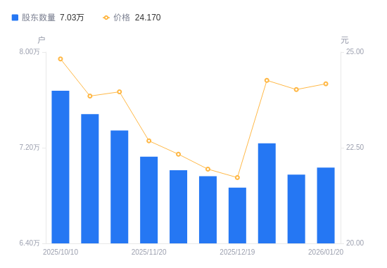 日期A股户数(户)流通A股户均持股数(股)户均持股市值(万元)2026-01-20703359995.1924.162026-01-096975610078.1624.212025-12-31723759713.4623.562025-12-196866310238.5822.242025-12-106961510098.5722.162025-11-287011410026.7022.392025-11-20712499866.9722.382025-10-31734369573.1222.942025-10-20748159396.6722.412025-10-10767639158.2122.73