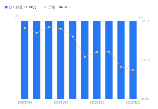 日期A股户数(户)流通A股户均持股数(股)户均持股市值(万元)2026-01-206000006469.0767.872025-12-316000006469.0768.532025-12-256000006469.0771.552025-12-206000006469.0771.502025-12-126000006469.0770.532025-11-306000006469.0774.572025-11-206000006469.0776.122025-11-106000006469.0776.482025-10-316000006469.0775.312025-10-206000006469.0776.26