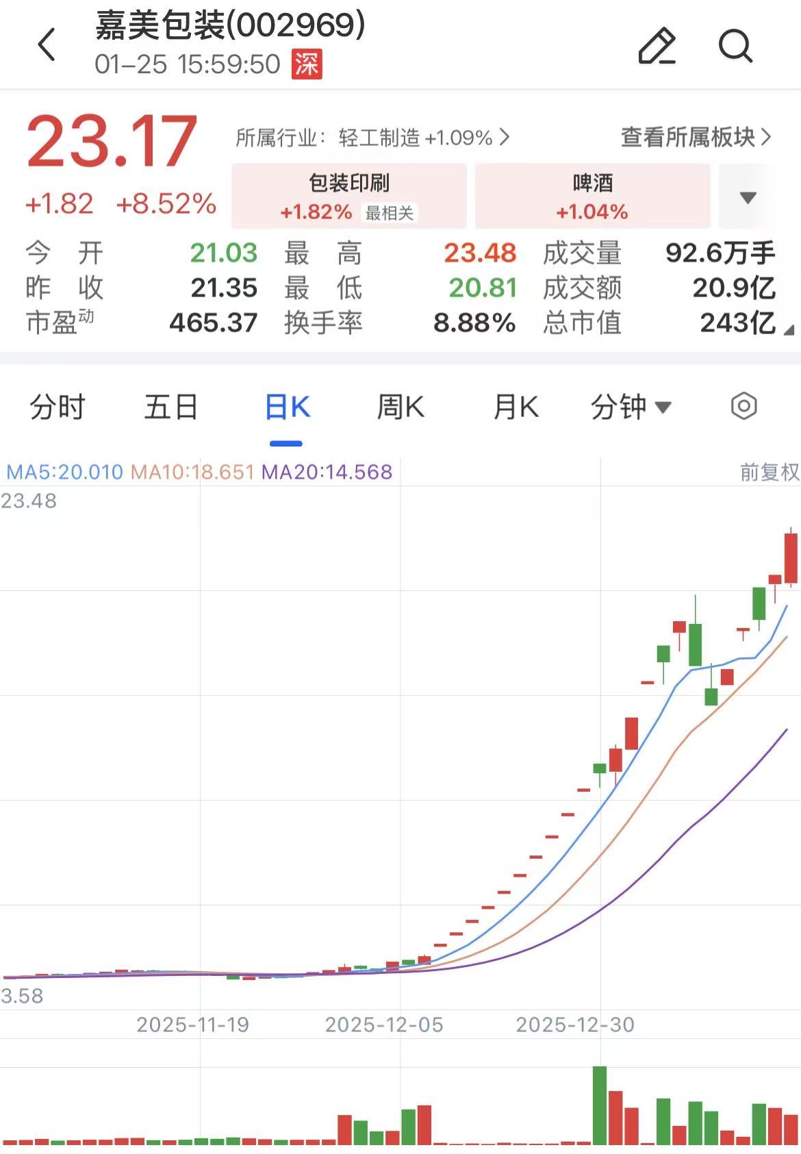 嘉美包装周五收涨8.52%,股价报23.48元再创新高,当前总市值为243亿元。值得一提的是,这也是嘉美包装月内第二次停牌核查,1月6日晚间,公司曾宣布进行停牌核查,复牌后股价仍延续震荡上涨态势。