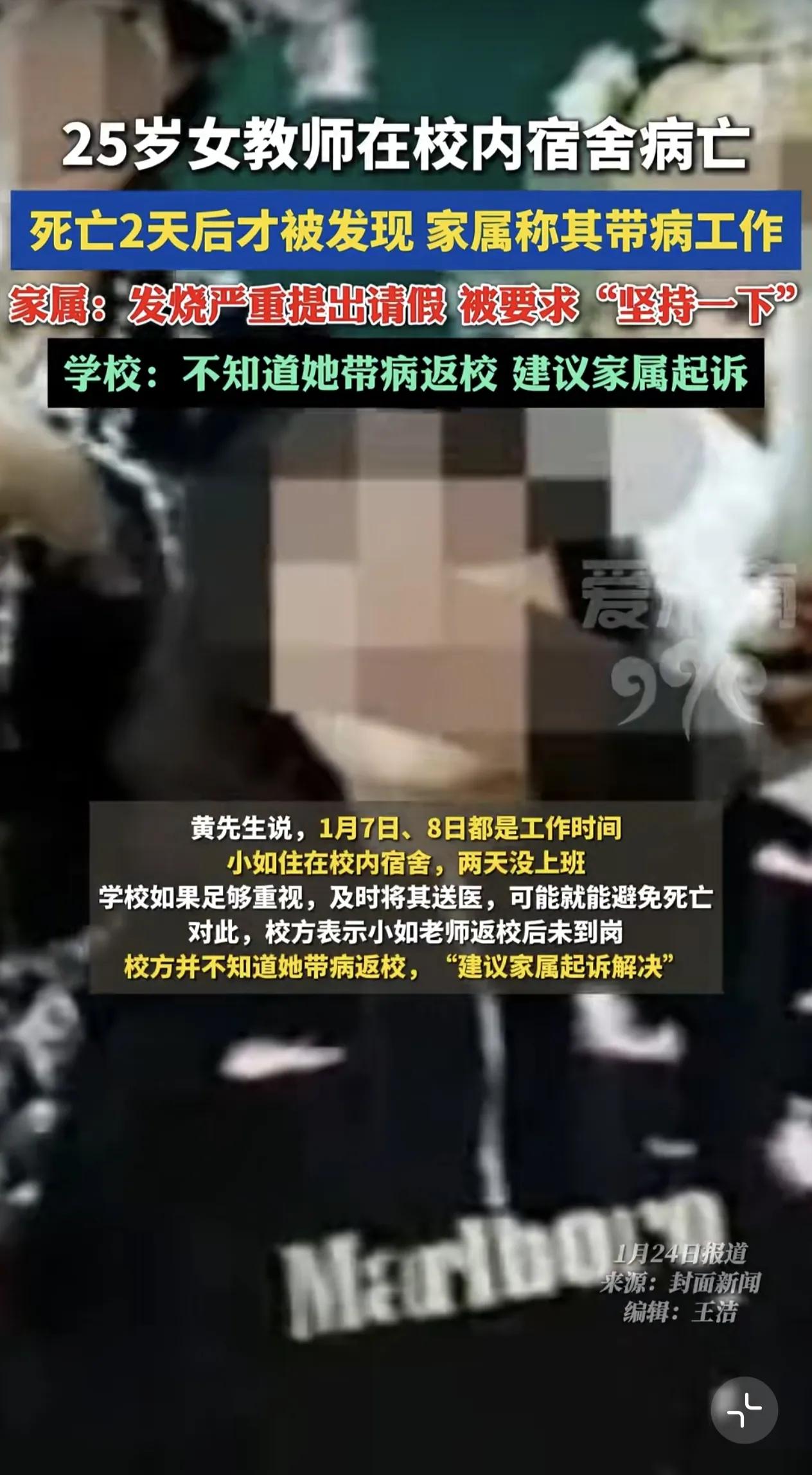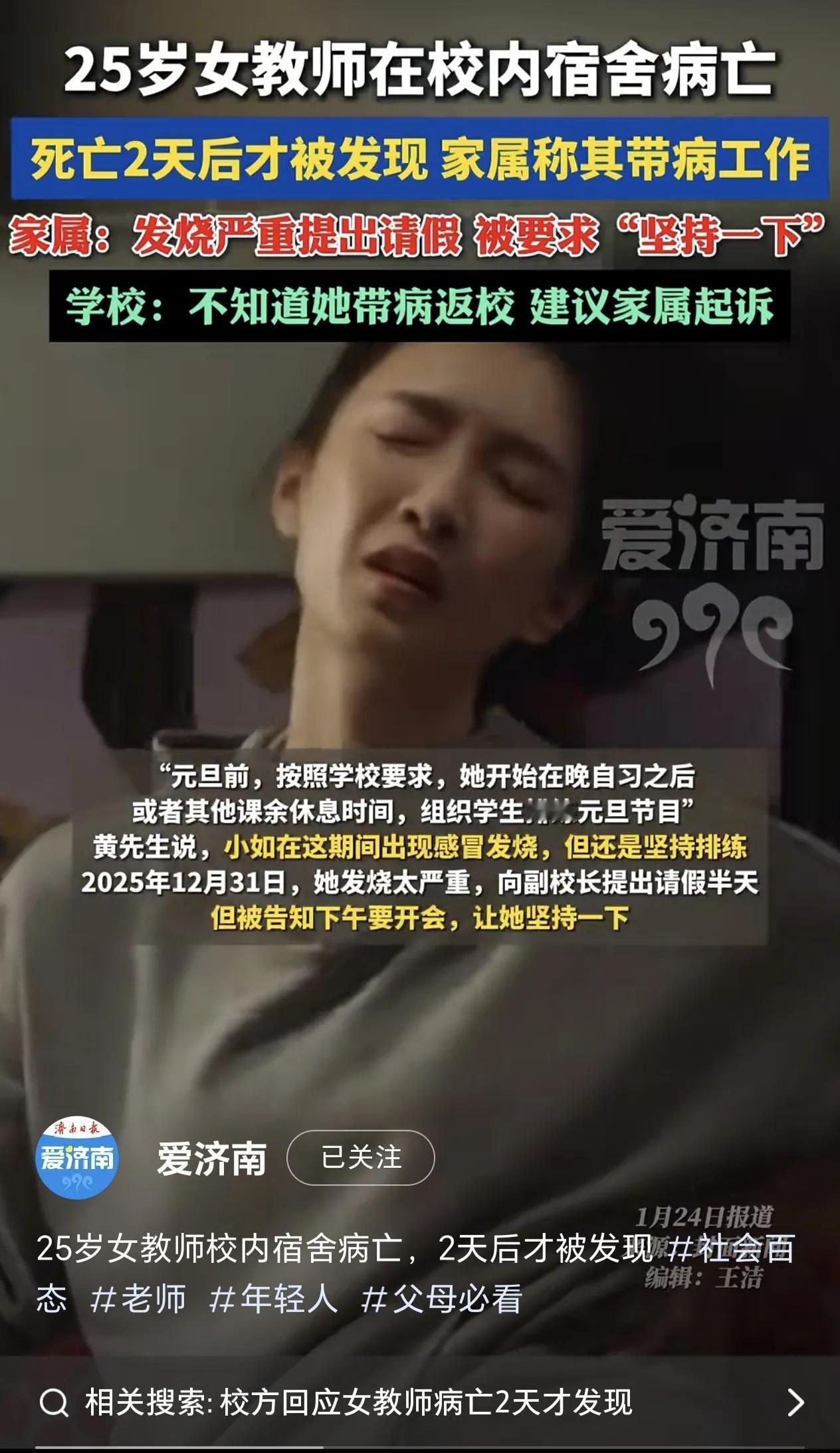 悲痛!又一名25岁年轻人倒下!程序员刚离世不久,近日安徽一名年轻女教师被发现在校内宿舍身亡… 感冒发烧,还被要求带班排练;实在扛不住想请假,却被一句“要开会 坚持一下”轻轻挡回。她最终没熬过去,在宿舍里独自离开人世…更让人心寒的是,从她失联到被发现,长达三天,竟无人察觉 这不是个例,就在前几天,另一位25岁的程序员也倒在了加班的工位上。我们身边有多少这样的年轻人,加班加点,身不由己,病了不敢停,累了不能说?请假成了奢侈? 两个25岁的生命,一个倒在了代码里,一个消失于宿舍中,他们用命换来的不只是一声叹息,而是一记响亮的耳光: 该请的假必须给,该停的时候就必须停,因为人不是机器,不要用“集体”“奉献”等说辞 来剥夺人休息的权力… 希望有一天我们也能看到,保障休息是“强制”的,随意加班是“违法”的…