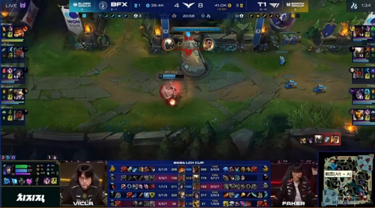 比赛进入中期,20分钟BFX三人下路强杀Faker加里奥,但是Oner潘森跳大+Keria巴德支援赶到,BFX野辅被换掉!T1拿下2K经济优势!随后再拿听牌龙!24分钟Kellin芮尔巧妙绕后配合队友秒了Peyz卡莎,随后Faker加里奥落大强行和Raptor琪亚娜互换,BFX的1换2!拆掉T1中一塔!