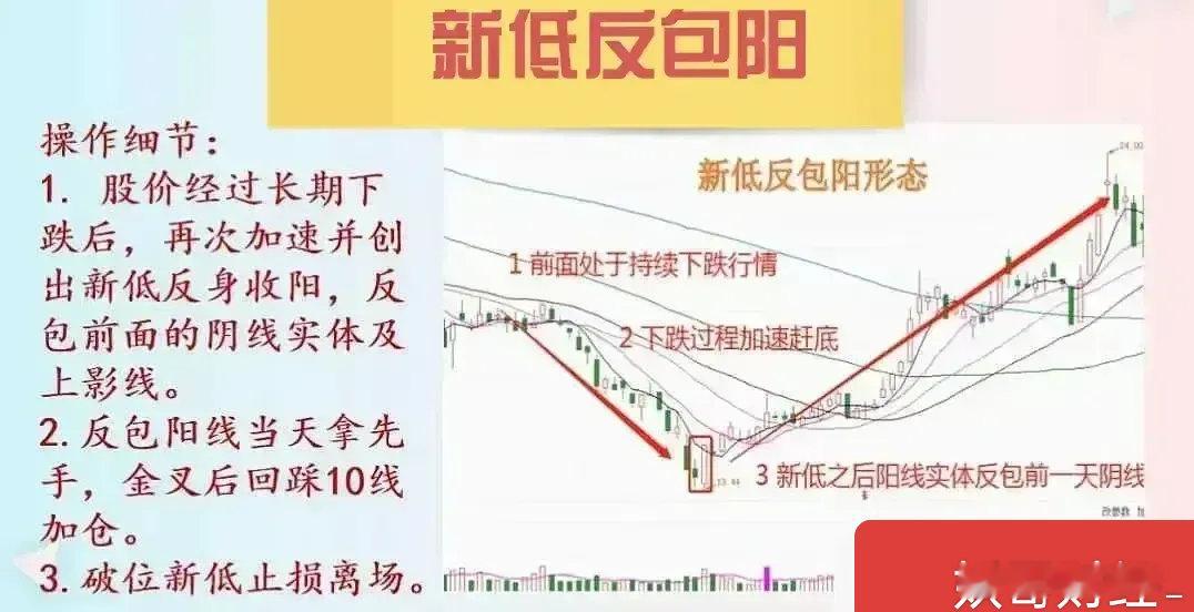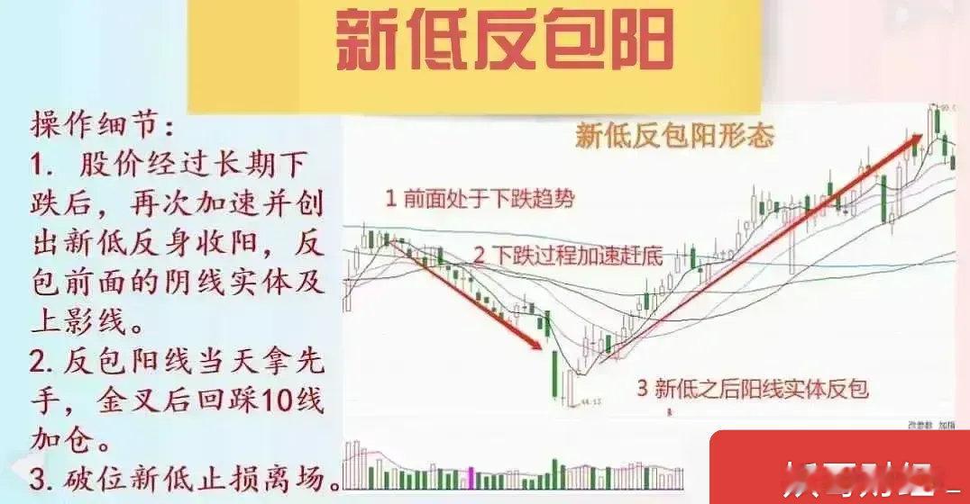 A股,但凡出现“新低反包阳”形态,我会毫不犹豫入场,往往能跟上主力吃肉。不论你是新手还是老手,认真领悟其中精髓,定会提高你的认知。一,什么是“新低反包阳”形态?该形态是指股价在经过一段趋势性下跌之后,出现了加速赶底的现象,在散户失去信心纷纷割肉之后,出现一根低开下探创出新低并且快速反包突破前面阴线高点的阳线,这是主力探明底部常见的反转信号。二,操作的核心要点:1.股价经过长期下跌放缓之后再次加速,在创出新低后企稳快速反转收出一根新低阳线,并且这根阳线的实体反包了前一根阴线,包括阴线的上阴线部分。2. 反包阳线出现后的当天尾盘收市前便是不错的先手机会,之后在均线金叉后出现回踩10日线时是二次加仓机会。3. 如果进场后股价走势不及预期跌破反包阳线低点时果断止损离场。以上便是新低反包阳形态的操作要点,为了方便大家学习和理解我在文后以图文示例,希望能够对大家有所帮助,同时妖哥会不定时的在评论区提示个股分享给大家,祝股市长虹。股票机器人中兴通讯