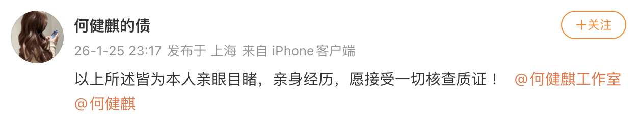 何健麒前女友再回应 何健麒前女友再回应:“以上所述皆为本人亲眼目睹,亲身经历,愿接受一切核查质证 !”