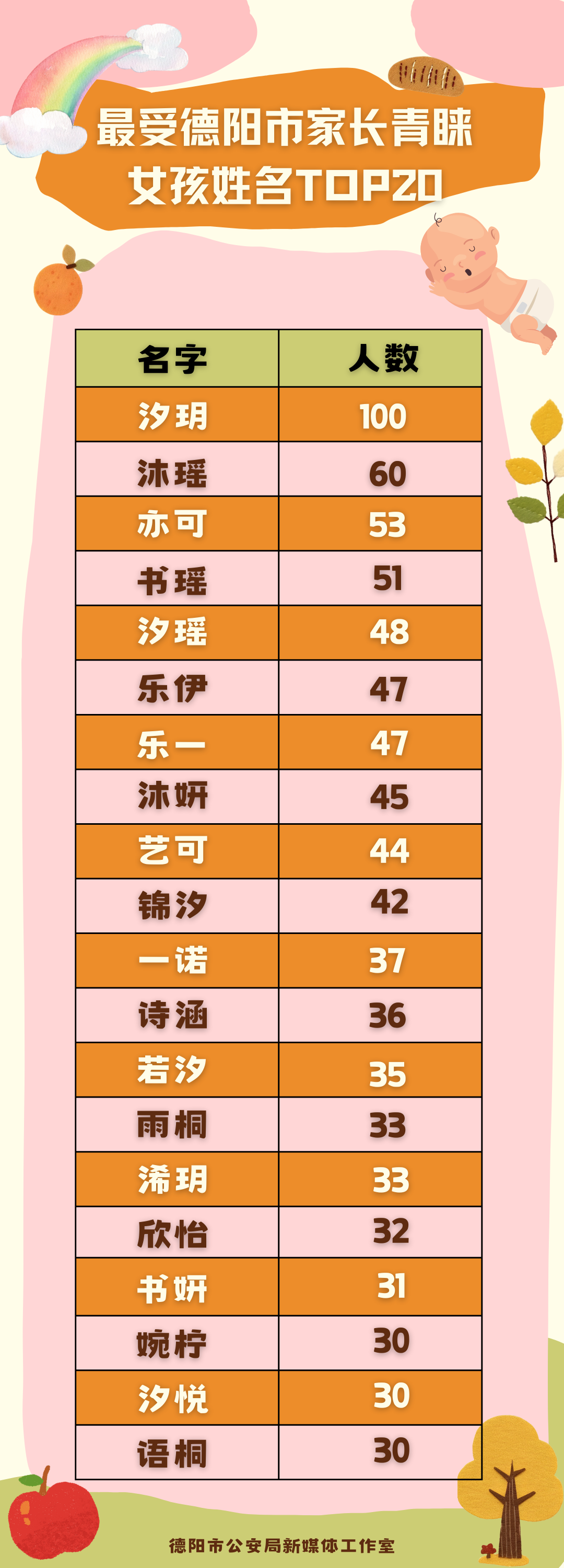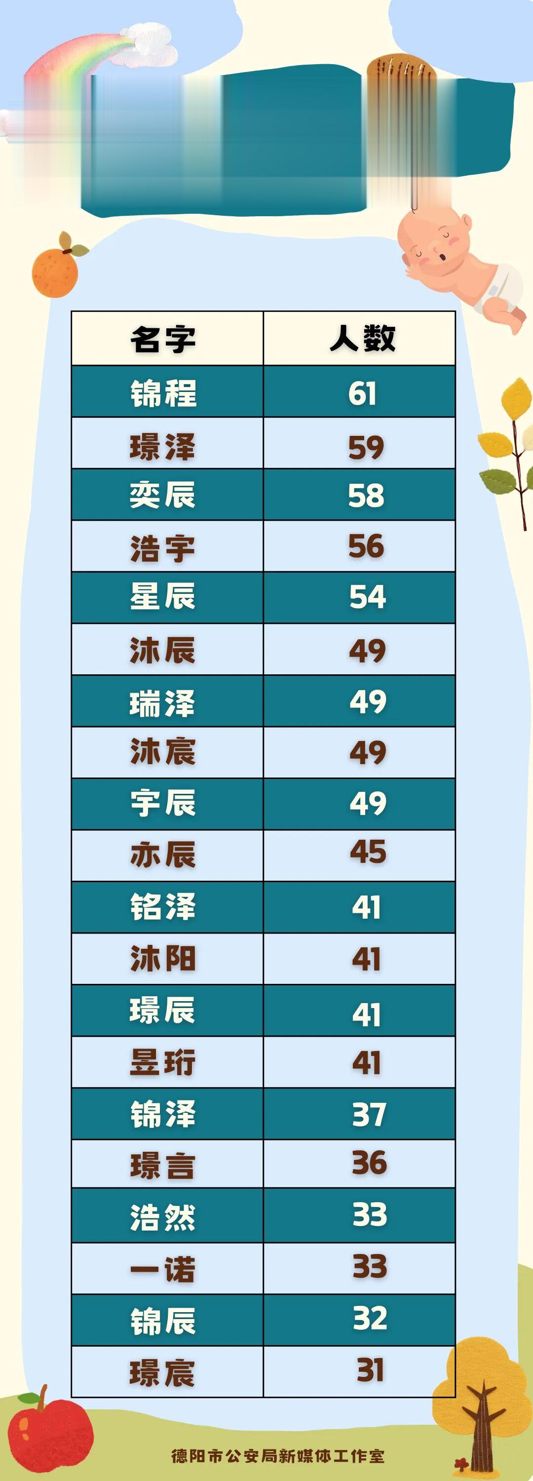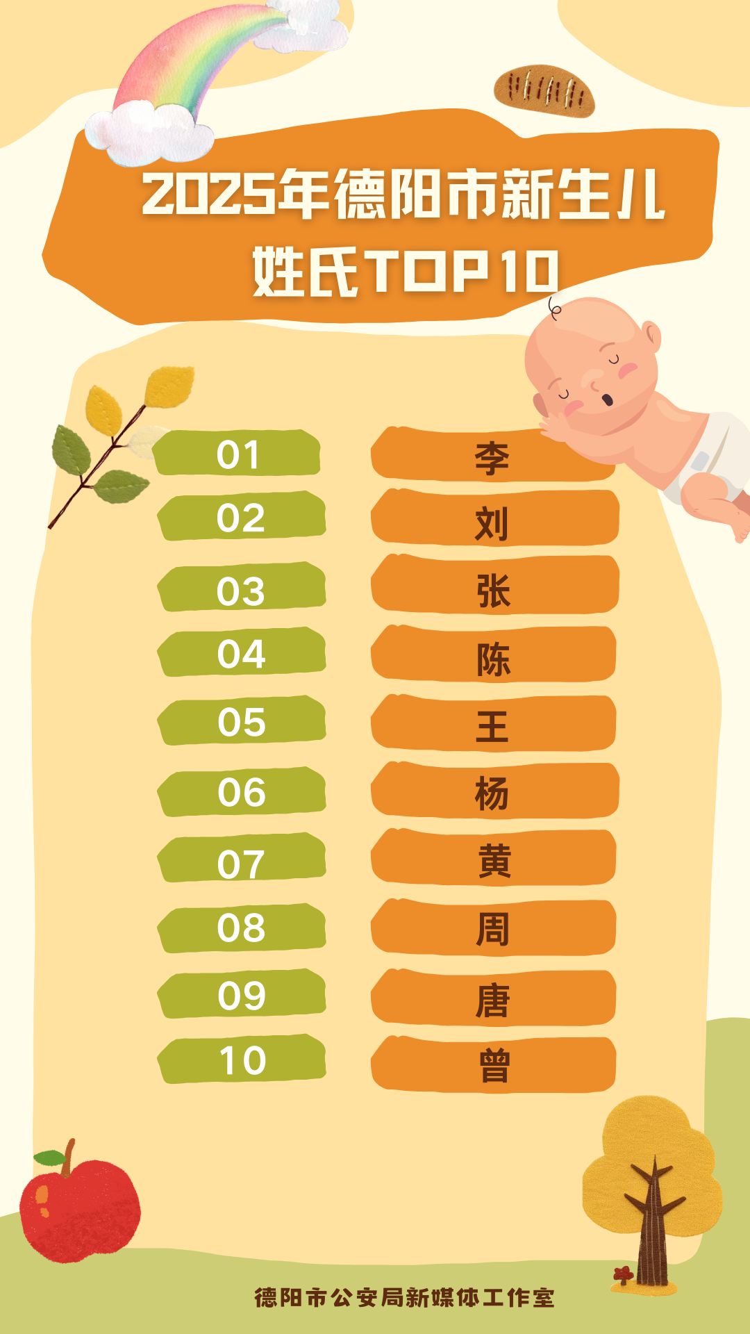 数据显示,在2025年德阳市新生儿中,姓氏最多的是“李”姓,有1874人,后面依次是“刘”“张”“陈”“王”“杨”“黄”“周”“唐”“曾”。