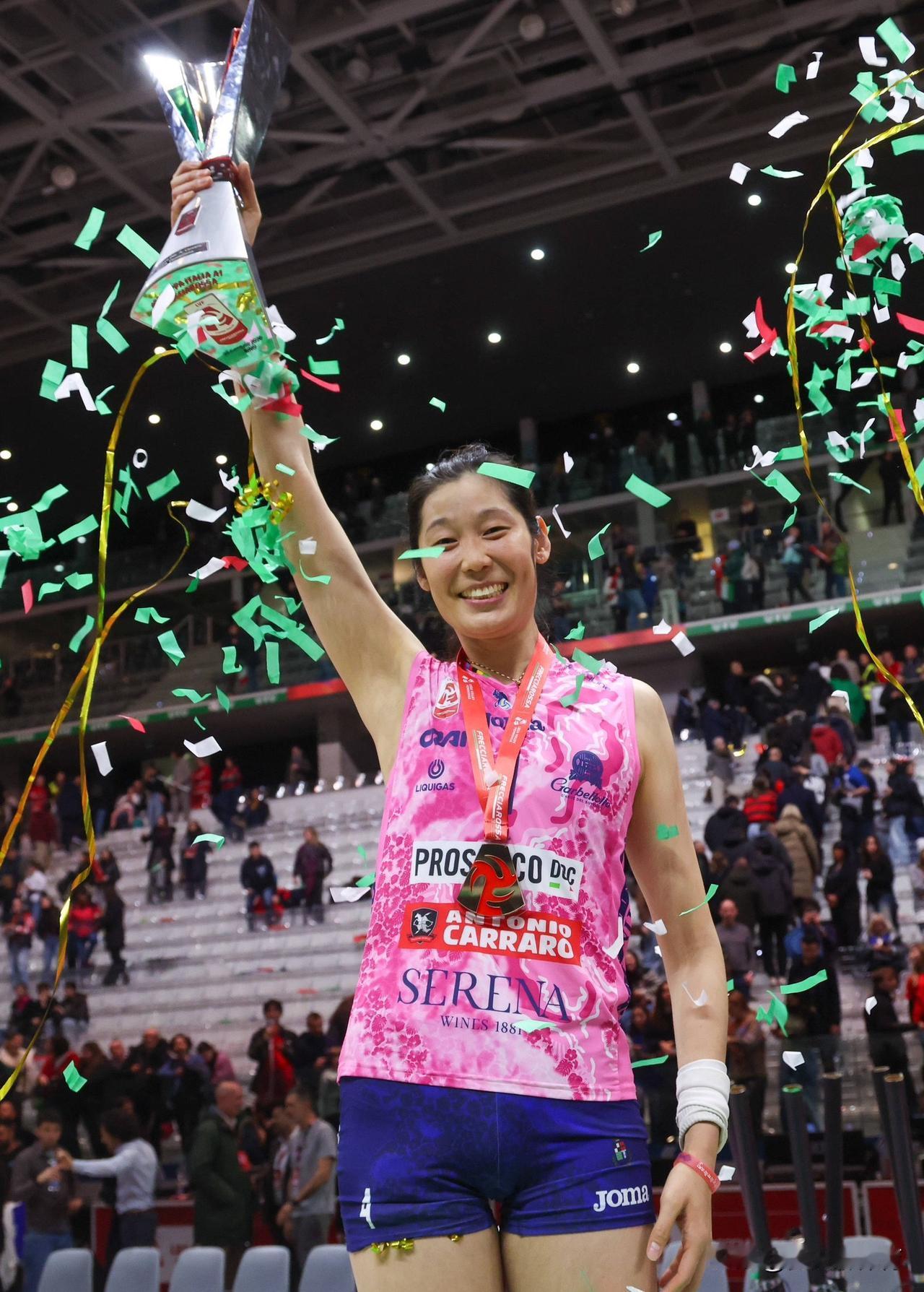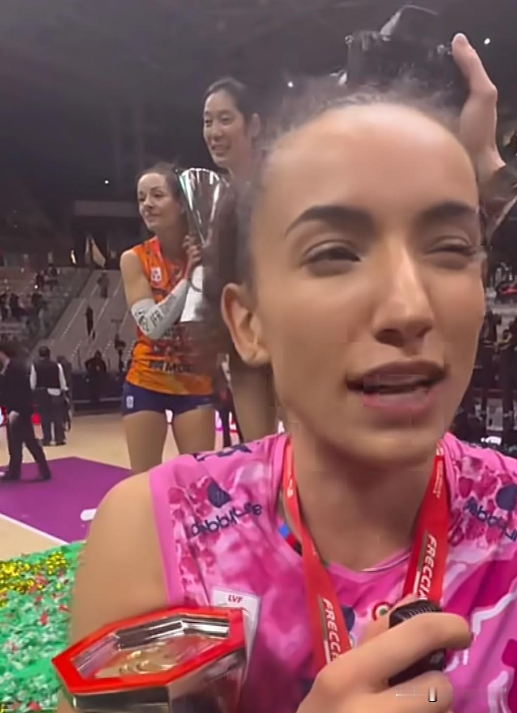 暖心一幕!科内利亚诺夺冠后,队员们都在纷纷排照庆祝胜利,轮到朱婷拍单人照片了,德吉纳罗给朱婷抛金丝带,好让朱婷也拍出有氛围感的照片,德吉纳罗真是一位暖心的大姐姐啊,对我们朱婷也是真好,还跟朱婷一起拍合照,优秀的人总是会惺惺相惜的,因为她知道朱婷对科内利亚诺的作用[流泪]德吉纳罗值得这个冠军,朱婷也更值得这个冠军!