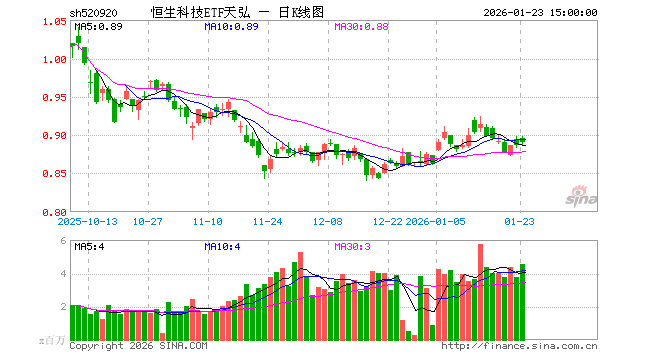 1月23日,恒生科技ETF天弘(520920)涨0.56%,成交额4.09亿元。当日份额增加2.00亿份,最新份额为154.09亿份,近20个交易日份额增加33.90亿份。最新资产净值计算值为137.36亿元。