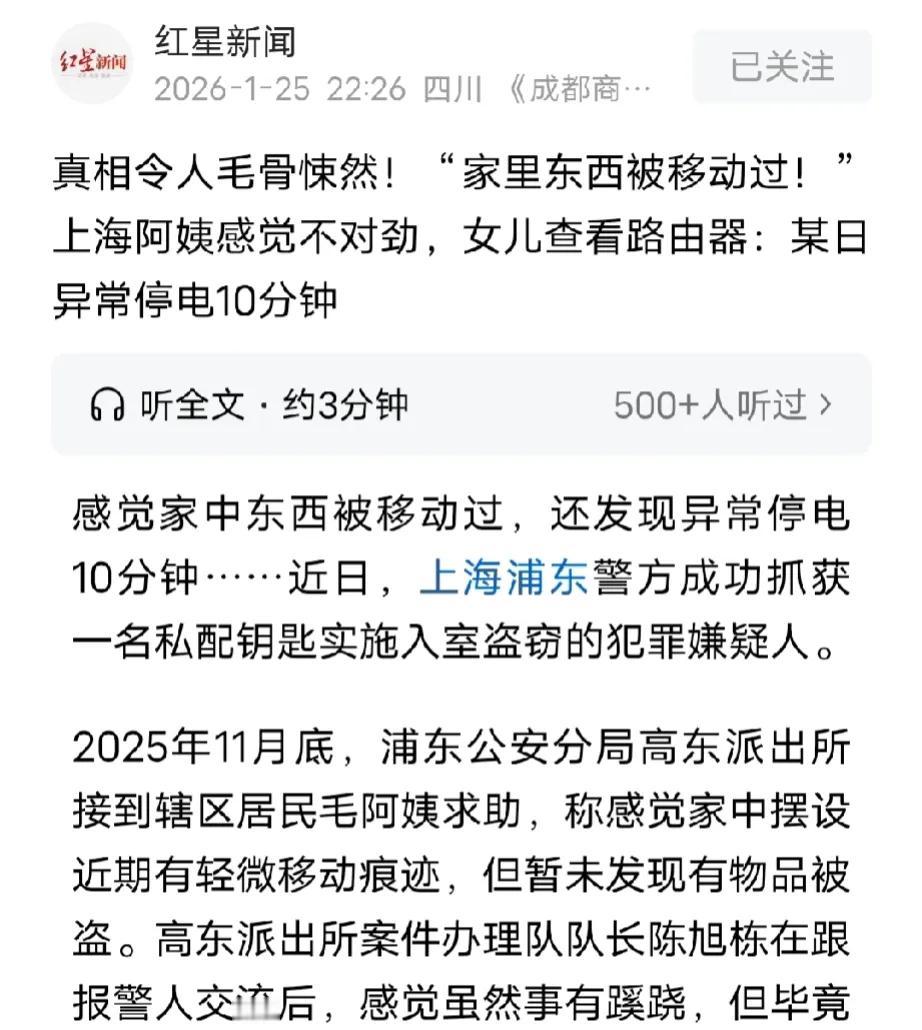 “细思极恐”上海,70岁阿姨无意中发现家中东西被人动过,于是报警处理,民警经过询问,阿姨女儿告知,她查看家里路由器发现,某天家里无故停电10分钟,她们怀疑家里进贼了,可家里的门窗却毫发无损,又没有丢任何东西,后来经过民警深入调查,发现了令人意想不到的一幕。 2025年11月底,毛阿姨在家里搞卫生时,无意中发现家里的东西有被人移动过的痕迹,她反复确认后,证实了自己的想法。 可毛阿姨查看了家里的门窗,却发现门窗都没有被人破坏的痕迹,门和窗都好好的,家里又没有外人进,到底是谁动了她的东西? 更让毛阿姨觉得奇怪的是,她家好像也没有弄丢任何东西。 但是,为了安全起见,她还是选择了报警处理,民警接到毛阿姨的电话后,迅速赶往她家。 民警听了毛阿姨的描述,也觉得事情很蹊跷,但是他们考虑到毛阿姨毕竟70多岁了,怀疑她记忆力不好,记错了东西的摆设。 为了弄清事情真相,民警联系了毛阿姨的女儿王女士。 王女士告诉民警,她母亲记忆力很好,应该没有记错,而且她通过查看家中路由器发现,2025年11月27日家中曾经无故停电10分钟。 当时小区里供电正常,只有她家莫名其妙停电10分钟,她怀疑家里有可能是进贼了。 民警在了解情况后,立即查看了11月27日当天小区里和路边的监控视频,民警经过反复对比、排除,很快锁定了嫌疑人为装修工丁某。 随后,毛阿姨再次认真清点家中财务,终于发现,家里一套纯金熊猫纪念金币和一枚金器不翼而飞。 今年1月份,民警将丁某抓获,面对民警的询问,起初丁某咬死不承认,他以为只要自己不承认,民警也没有确凿的证据,他就能蒙混过关,逃过一劫。 没想到,民警当场甩出了他的银行流水记录,上面清晰记录着丁某在2025年9月份,曾经有过3笔可疑交易,分别是不同的三家金店,总收入为58200元。 在确凿的证据面前丁某哑口无言,最终承认,去年9月份,他在帮毛阿姨更换入户门锁时,偷偷配了毛阿姨家的钥匙。 有了钥匙后,不久的一天,他趁毛阿姨不在家,偷偷潜入她家偷走金器销赃。 丁某在第一次得手后,忐忑不安地度过了两个月,最终他发现,自己顺利躲过一劫,贼心再次泛滥。 2025年11月27日,丁某看毛阿姨不在家,再次潜入毛阿姨家,可他才进到毛阿姨家里,就意外发现,她家中有安防设备,担心自己暴露,丁某赶紧拉闸停电逃跑。 警方在查明丁某有盗窃嫌疑后,目前,已依法对他采取刑事拘留措施,相关案件后续还会继续办理。 这丁某真的太缺 德了,简直细思极恐!借着换锁的由头偷配钥匙,第一次得手没被发现,居然还敢二次上门。 要不是毛阿姨细心发现物品被动过,恐怕这事儿就被他瞒天过海了。 更吓人的是,他第二次入室发现有安防设备,居然还敢拉闸断电跑路,心思也太缜密了。 亏得民警给力,靠着监控和银行流水揪出了他。这种利用别人信任作恶的人,必须受到严惩,真是活该被刑拘! 丁某的行为已构成盗窃罪,他借换锁之机偷配钥匙,两次非法进入毛阿姨住宅盗窃,属于“入户盗窃”,即便未盗得财物也已构罪 。 其盗窃金器销赃得款58200元,远超“数额巨大”(3万元至10万元)标准,应处三年以上十年以下有期徒刑并处罚金 。 丁某利用被害人信任作案,且二次入户时为逃避抓捕拉闸断电,主观恶性较大,量刑时会作为从重情节考量。 目前丁某被刑事拘留,案件将按法定程序进一步办理,法律会依法维护被害人的财产权与住宅安宁权。