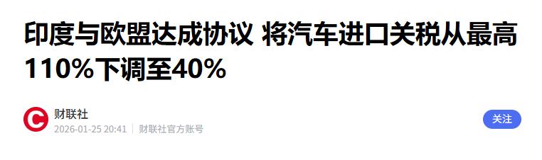 果然被我说中了, 印度宣布: 1月25日,印度与欧盟宣布正式达成贸易协议,同意将汽车进口关税从惊人的最高110%立即下调至40%,并计划逐步降至10%。 这俩人的贸易协定谈得比长篇连续剧还拖沓,从2007年就磨磨唧唧搭起了谈判桌,原名叫“印欧广泛基础双边贸易投资协定”,结果聊到2013年就因为各种分歧谈崩停摆,一放就是好几年,直到2022年才又重新坐回一起。能在2026年1月25日正式官宣,压根不是突然情投意合,全是被现实逼出来的抱团取暖。 背后最大的推手其实是美国,特朗普政府上台后的关税大棒抡得太狠,欧盟这边日子不好过,原本把美国当成主要贸易伙伴,可对方说加关税就加关税,完全不讲道理。 欧盟27国没办法,只能赶紧转头找靠谱的新市场,亚太地区就成了重点,印度这个有14亿人口、经济规模达4.2万亿美元的市场,自然成了香饽饽。 德国作为欧盟最大出口国,动作最积极,总理默茨专门跑了趟印度,说白了就是想拉着印度一起降低对中国的经济依赖,同时躲开美国关税带来的不确定性。 印度这边也有自己的小算盘,2023年之后欧盟逐步取消了对印度纺织品、服装、制药等产品的关税优惠,美国又对印度商品加征了50%的关税,出口压力山大。 刚好借着欧盟找新伙伴的机会,换点实在好处,核心就是让欧盟对自己的劳动密集型产品放开零关税准入,还想让IT服务和专业技术人员在欧洲更自由流动。 毕竟2024至2025年度,印度和欧盟的双边贸易额已经达到1375亿美元,其中印度出口758.5亿美元,欧盟占了印度出口总额的17%,这笔生意丢不起。 所以这次的协议本质就是互相交换筹码,印度先松了汽车关税的口。之前把关税抬到110%,说白了就是把家门焊死,不让欧洲车进来抢本土市场,现在一下子降到40%,还承诺逐步降到10%,就是给欧盟递的投名状。 欧盟也投桃报李,打算放开汽车、医疗器械、葡萄酒这些产品的市场准入,德国车企已经率先行动,梅赛德斯-奔驰都宣布要在印度投产迈巴赫GLS超豪华车型,让印度成了美国之外首个生产这款车的市场,算盘打得噼啪响。 不过俩人也没完全交底,都留了后手。印度直接把农业和乳制品排除在协议之外,就是怕欧洲的农产品进来冲击本土小农户的利益,这可是关乎数百万人生计的大事,一点都不敢含糊。 欧盟这边也有顾虑,虽然盼着印度多降关税,但印度只同意取消90%左右商品的关税,没达到欧盟原本想要的95%,汽车、钢铁这些棘手领域还处于拉锯状态,印度甚至提出要搞阶段性减税或者配额限制,就怕本土制造业被冲垮。 还有个绕不开的矛盾是欧盟的碳边界调节机制,这东西专门对钢铁、水泥等高碳排放产品收费,已经开始给印度出口产品添负担,印度政府对此意见很大,这部分分歧到现在也没完全解决。 而且协议签了不算完,还得经过欧洲议会批准,这个过程至少要一年,之前欧盟和南美国家的协定就被议会告到了最高法院,谁也说不准这次会不会出岔子。 俩人还把合作延伸到了安全防务领域,法国要在印度建“阵风”战斗机生产线,德国和印度签了19项协议,涵盖防务、半导体、关键矿产等领域,甚至计划建安全与防务伙伴关系,印度企业还有可能参与欧盟1500亿欧元的“欧洲安全行动”基金项目。 说穿了就是不仅要在经济上绑定,还要在安全上互相靠,一起应对全球贸易格局的变化。 欧盟主席冯德莱恩把这协议吹成“历史性”的,还说要打造一个覆盖20亿消费者、占全球GDP近四分之一的超级市场,印度商务部长也跟着捧,叫它“所有贸易协定之母”。 但说白了就是俩都被美国折腾得够呛的经济体,各取所需凑在一起过日子,谁也不是真心为了对方。印度降关税是为了换出口市场,欧盟拉印度是为了供应链多元化,至于这协议能不能顺利落地,落地后能不能达到各自的预期,还得看后续的磨合,毕竟互相算计的合作,从来都不缺变数。