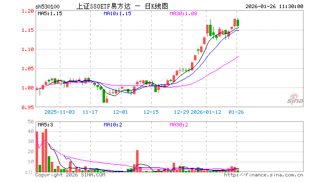 上证580ETF易方达(530100)业绩比较基准为上证580指数收益率,管理人为易方达基金管理有限公司,基金经理为李博扬,成立(2025-10-10)以来回报为17.90%,近一个月回报为15.84%。