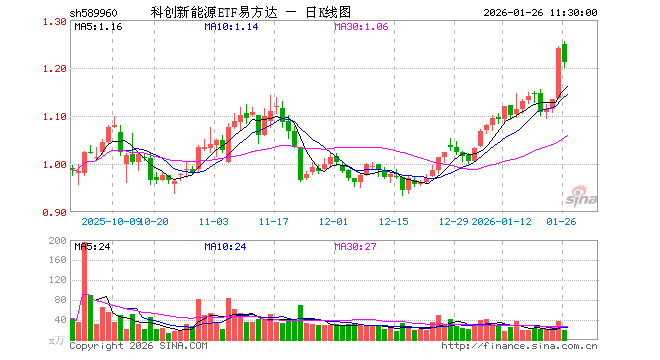 1月26日,截止午间收盘,科创新能源ETF易方达(589960)跌2.26%,报1.212元,成交额2362.26万元。科创新能源ETF易方达(589960)重仓股方面,晶科能源截止午盘跌2.46%,阿特斯跌4.54%,天合光能跌0.67%,容百科技跌5.55%,大全能源跌3.99%,厦钨新能跌1.19%,嘉元科技跌1.93%,天奈科技跌2.64%,孚能科技跌3.12%,固德威涨1.01%。