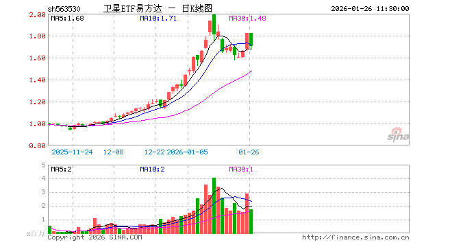 卫星ETF易方达(563530)业绩比较基准为中证卫星产业指数收益率,管理人为易方达基金管理有限公司,基金经理为张泽峰,成立(2025-11-05)以来回报为80.82%,近一个月回报为57.06%。