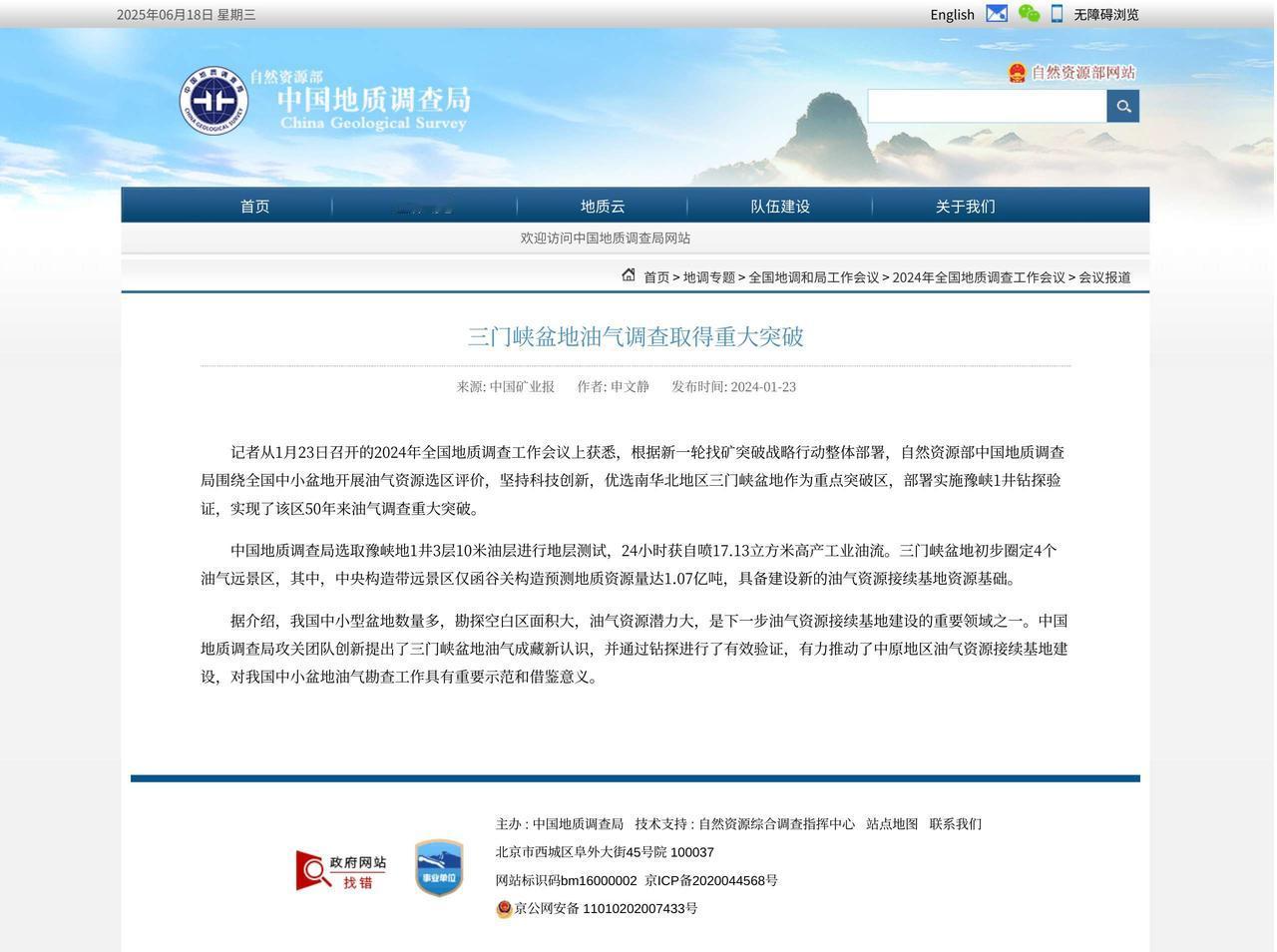 沉睡两千万载,三门峡发现大型油田,背后功臣竟是一口寻常地热井 2021年的豫西灵宝,黄土塬被毒辣的太阳烤得发蔫,一处民企的地热井工地上,钻机正没日没夜地往地下钻。 谁也没想到,这口为了获取地热资源的寻常钻井,会在钻头探入地下两千多米时,搅醒一个沉睡了数千万年的地下油库。 钻井的时候,工人们本以为最多是热水冒出来,没成想,随着钻头一点点深入,地下突然喷出油气,那股味道在空气中炸开,所有人都愣了。 消息传开后,地质专家们赶到现场,立刻组织勘查。 这一查不得了,整个三门峡盆地原来暗藏玄机。 早在上世纪五十年代,三门峡盆地就被列入过油气勘察区域,但因为技术手段和认知有限,加上开发重心当时放在东北和华北成熟油田,这片区域就被搁置了。 几十年里,这块地沉寂得像是被遗忘了一样。 直到这口地热井误打误撞,才让大家重新审视这片土地的价值。 2023年,国家把三门峡盆地纳入了新一轮找矿突破战略重点区域。 中国地质调查局迅速部署了豫峡地1井,这是当年全国唯一一口专门用于油气调查的探井。 从9月23日开钻,到10月29日完钻,总深度接近2300米。 测井解释显示有五层油层,试采选了其中三层,总厚度10米。 24小时自喷产量达到17.13立方米,出油品质极高,属于轻质纯油,没有一滴水。 初步评估结果吓了不少人一跳,仅仅是函谷关构造区域,预测资源量就突破了一亿吨,符合大型油田标准。 河南省和自然资源部迅速调整动作,采取新机制。 政府主导,公益先行,商业跟进,科技保障,基金支撑。 中国地质调查局和河南省地质局签订合作协议,集中力量攻坚灵宝区块。 到了2024年,豫灵1井和豫灵2井相继开钻。 两口井都打出了工业级高产油流。 豫灵1井日产稳定在15.5立方米,豫灵2井更是分别自喷31.62立方米,机抽产量高达92.52立方米,全部都是纯油。 相关数据汇总后,对整个三门峡盆地的资源量进行了重新评估。 最终结果是,常规石油地质资源量达到4.27亿吨。 这个数字放在全国中小型油气盆地里,堪称头部选手。 原来大家一直以为中原地区不适合找油,其实不是没油,而是过去方法跟不上,思路也没打开。 这次三门峡的发现,不仅彻底打破了南华北地区少油的旧印象,还为全国356个类似盆地提供了样板路径。 以前这些地方勘探成本高,风险大,企业不愿意投。 现在公益性先行打头阵,国家和地方联手,企业再跟进,风险小了,效率高了。 从油田开发来看,三门峡还没有大规模进入产能阶段,但资源量已经摆在那里,未来潜力巨大。 2024年全国原油产量突破2.13亿吨,油气当量首次跨过4亿吨关口。 三门峡这个新油田虽然还没正式贡献产量,但已经在能源安全这条线上添上了关键一环。 这对于国内持续推进能源独立、自主保障原油供应,有着不言而喻的重要意义。 对于河南本地来说,这个发现是实打实的利好。 作为农业大省,河南的工业能力并不弱,但长期缺乏能源支撑。 现在在自家地盘下发现了油田,不仅能带动石化产业链,未来相关管道、加工、运输、配套设施一建,税收、就业、人口流动都会迎来新一轮变化。 目前许昌、漯河、周口等地的探矿权已经开始出让,中原油田也在扩展区块,整个区域的产业布局将随之重构。 从另一个角度说,这次的成功也让人重新认识了地质调查的意义。 当年那些默默在黄土塬下走过的地质队员,扛着罗盘和背包翻山越岭,虽然没看到最终成果,但正是他们留下的数据和路线图,才让今天的突破成为可能。 如今,三门峡的故事还在继续。 试验区要进一步完善,产能要逐步扩大,环保监测也必须全程同步推进。 全国还有两百多个中小盆地等着摸底,背包里的地质图还没翻完,钻机的声音,还会在更多地方响起。 信息来源:三门峡盆地油气调查取得重大突破.中国地质调查局官网