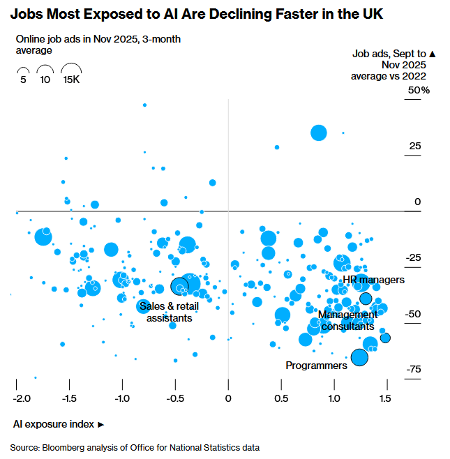 但目前,人们的注意力集中在AI如何加剧英国的就业危机,尤其是对年轻人和白领而言。上周公布的官方数据显示,自2022年以来,全经济的空缺岗位减少了三分之一以上——相当于50万个职位。其中五分之一的下降是由一些最有可能受到AI影响的行业推动的,比如专业、科学和技术活动、行政服务和信息技术。