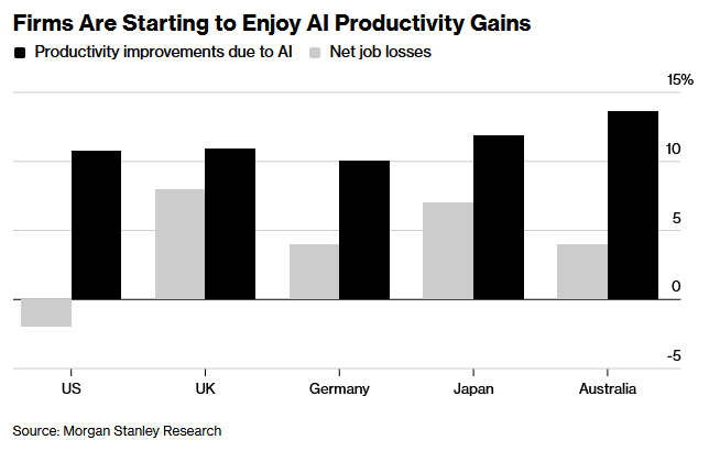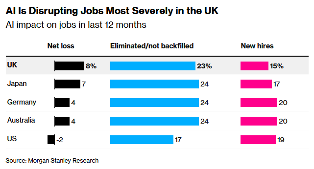 摩根士丹利的研究发现,英国因人工智能(AI)而裁掉的岗位数量比创造出来的岗位数量更多,且速度比其他国家更快。研究显示,英国企业报告称,在过去12个月里,AI导致的岗位净损失率为8%,这一比率在包括德国、美国、日本和澳大利亚等国家在内的所有企业群体中是最高的,也是国际平均水平的两倍。