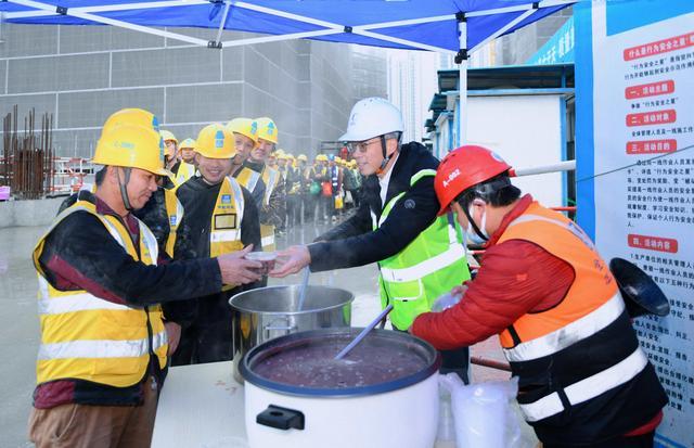 上午十一点,忙碌了半天的工友们有序列队,接过爱心满满的暖冬大礼包。建设单位项目总经理林天爵带领志愿者们化身暖心使者,将项目办公室与后勤工作人员亲手熬制的腊八粥,逐一端到每一位劳动者手中。热气氤氲间,冬日的寒意瞬间消散,一张张淳朴的笑脸,成为工地上最动人的风景。“腊八送暖从不是一次简单的节日慰问,而是工会聚焦职工急难愁盼、升级服务质效的常态化实践!”分公司工会主席罗召光表示,分公司所有项目同步设点,就是要让每一位坚守岗位的工友,都能喝上一碗热粥,感受穿透寒冬的温暖与牵挂。