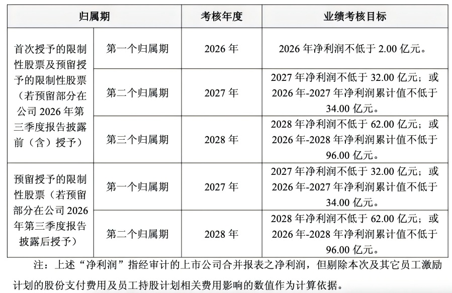 具体目标为:2026年净利润不低于2亿元,2027年不低于32亿元或2026年至2027年累计值不低于34亿元,2028年则不低于62亿元或2026年至2028年累计不低于96亿元。