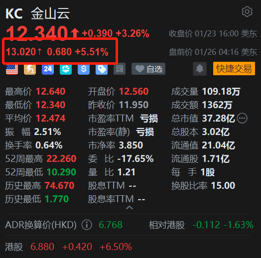 金山云港股今日收涨6.5%,带动金山云(KC.US)美股盘前续涨5.5%,该股此前已录得3连升。