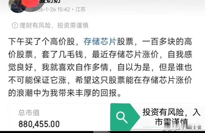 【A股今天】心可真大! 这可是股票市场啊!股票集风险性、残酷性与盈利性于一身。 在这样的背景下,有位老人偏爱做短线,还采用一把梭哈的操作手法!100多块钱一股的股票,一买就是近百万。看看这些资本套利题材股,难道就不给自己留点儿后手吗?要知道,在国际市场可没有涨跌停板制度,说不定一天就能让你赔掉数十万。 也许这位老人家底丰厚,但这种既耗费精力又让人提心吊胆的投资,确实不太适合她这个年纪的人!